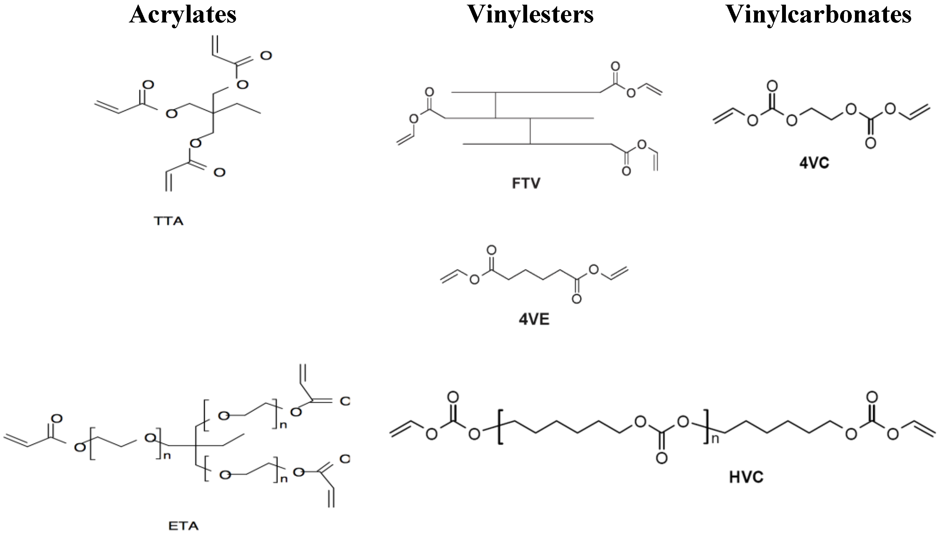 Investigated vinylester and vinylcarbonate monomers and acrylate references. Acrylates: Ethoxylated trimethylolpropane triacrylate (ETA) and trimethylolpropane triacrylate (TTA); Vinylesters: Adipic acid divinyl ester (4VE) and trimer fatty acid vinyl ester (FTV); Vinylcarbonates: Ethylene glycol divinyl carbonate (4VC) and poly(hexamethylene carbonate) divinyl carbonate (HVC).