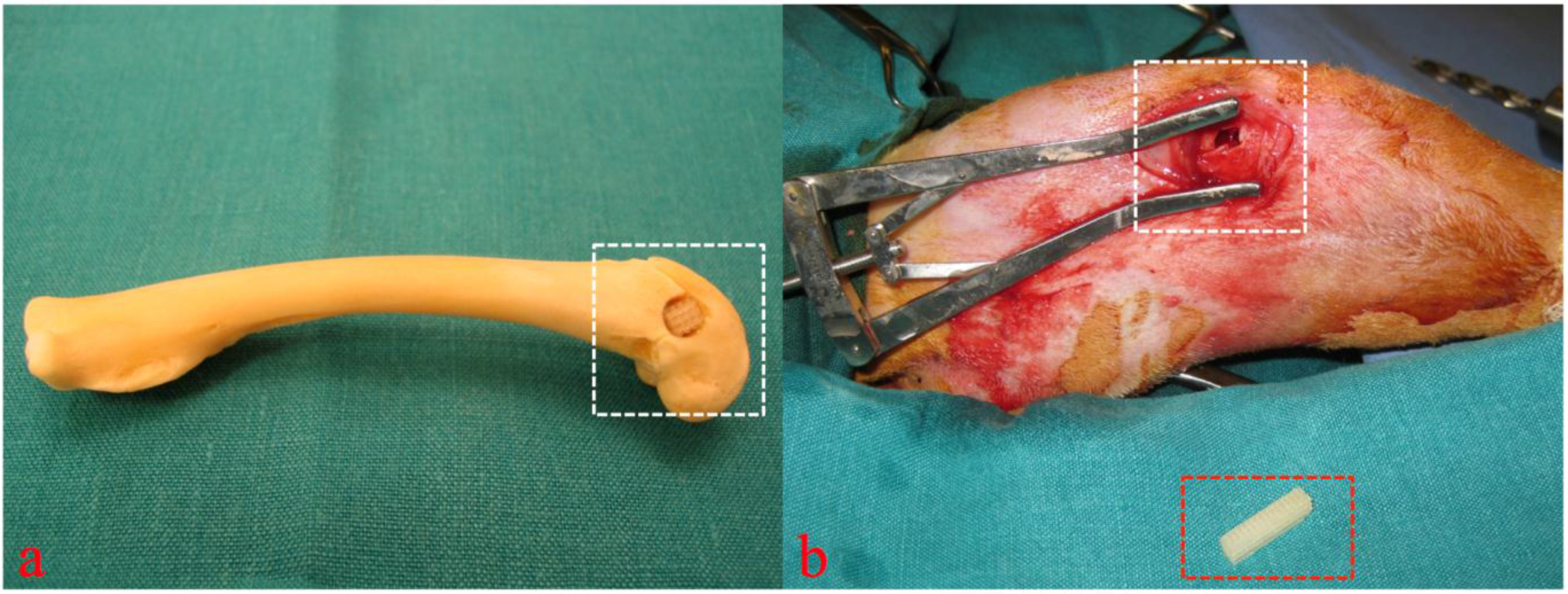 Cadaver simulation (a) and intra operative view (b, figure from [19]) of implantation site (white rectangular) and 3D cellular structure (red rectangular) before insertion into the drilling defect. Copyright John Wiley and Sons 2015.
