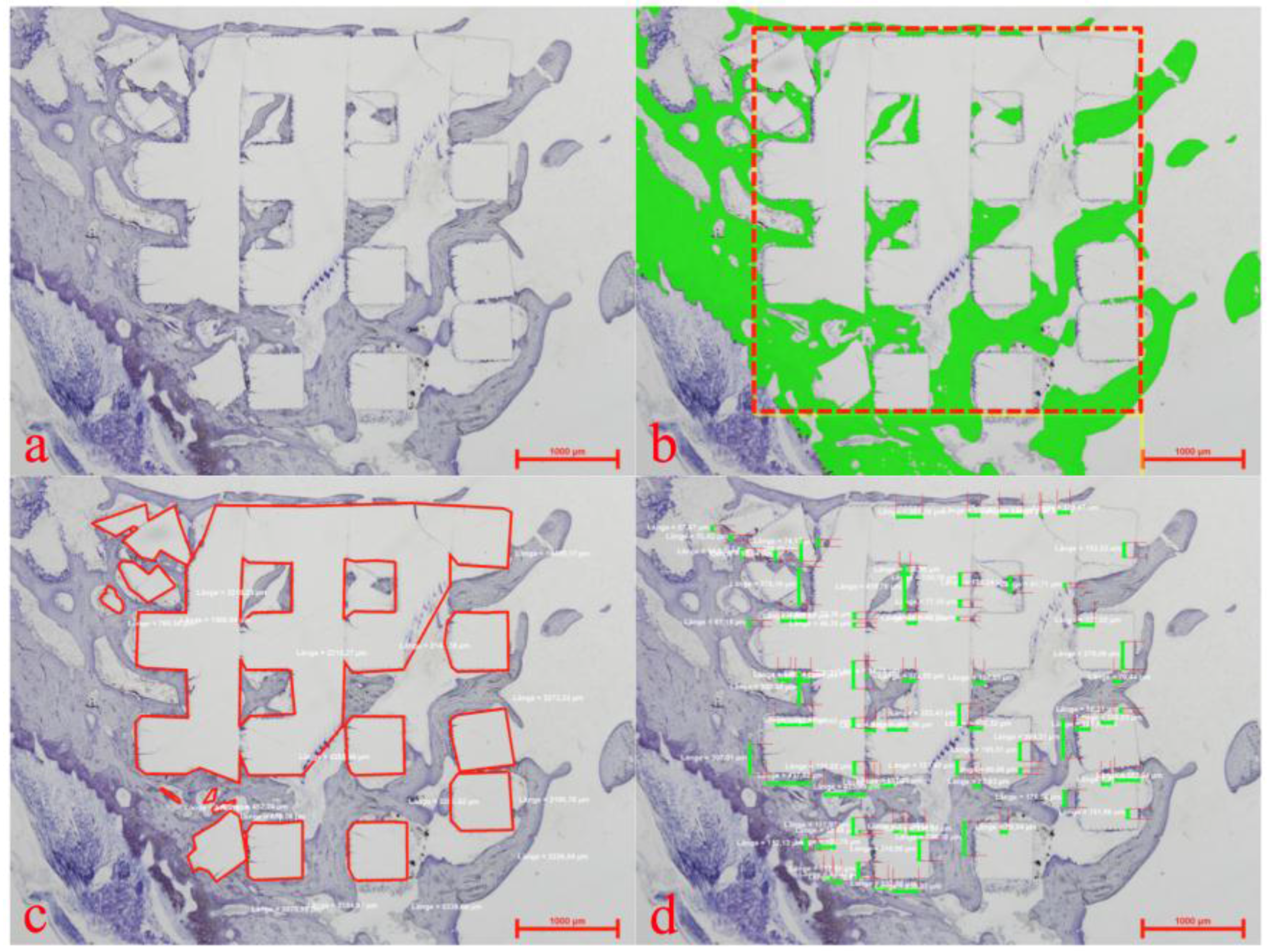 Histomorphometric evaluation showing a plain thionine stain (a), the region of interest (b) (red rectangular) for assessment of newly formed bone (b) (green), the marked extent of the implanted 3D cellular structure (c) (red lines) and allocation of bone to implant contact (d) (green bars).