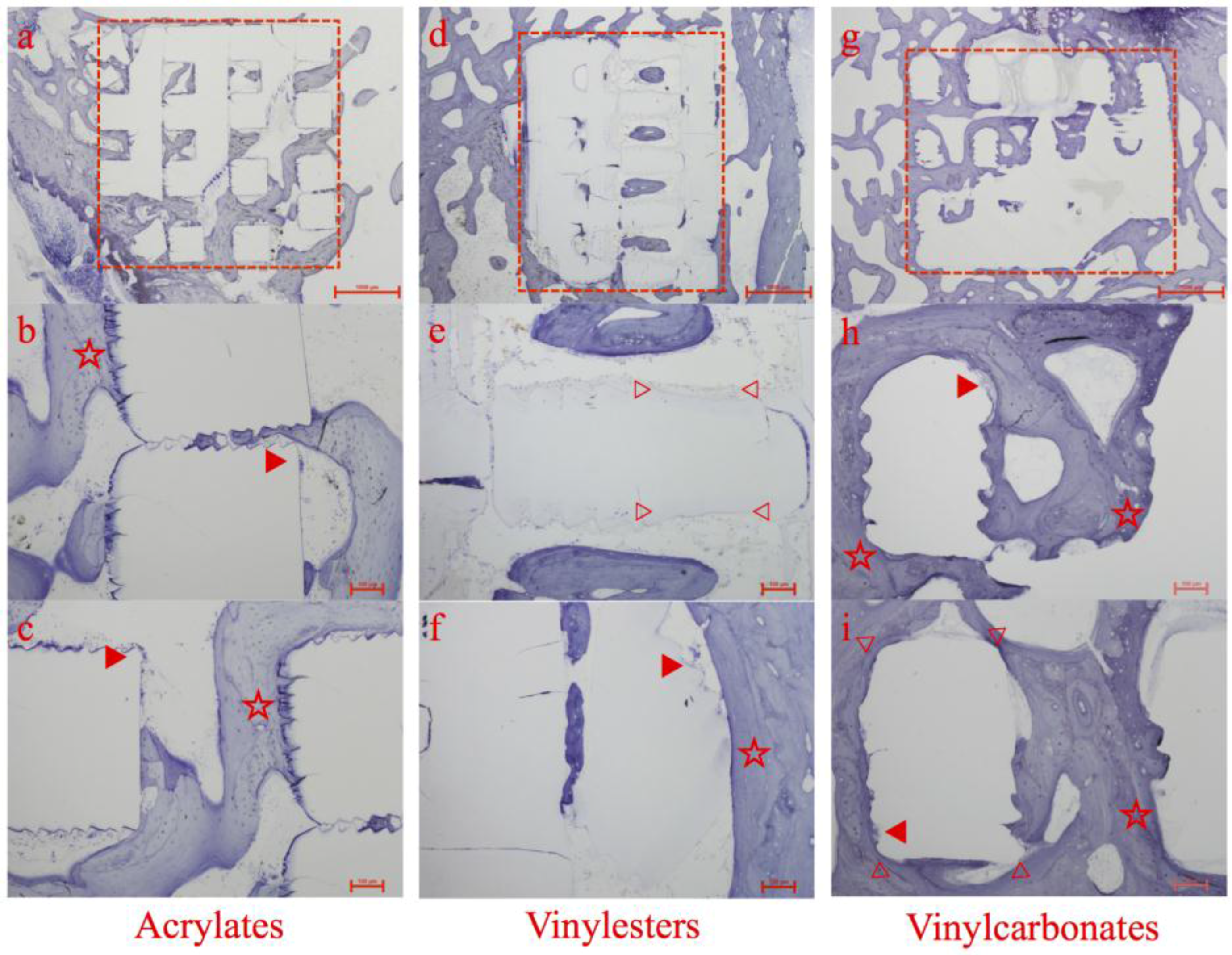 Histologic overview and details of specimens containing acrylates (a–c), vinylesters (d–f), and vinyl carbonates (g–i) as 3D cellular structures (marked as red rectangular in a, d and g) retrieved after 12 weeks of observation. Marked details represent foreign body giant cells (▶), areas of high bone to implant contact (☆) and areas of obvious surface erosion/resorption (▷ ◁).