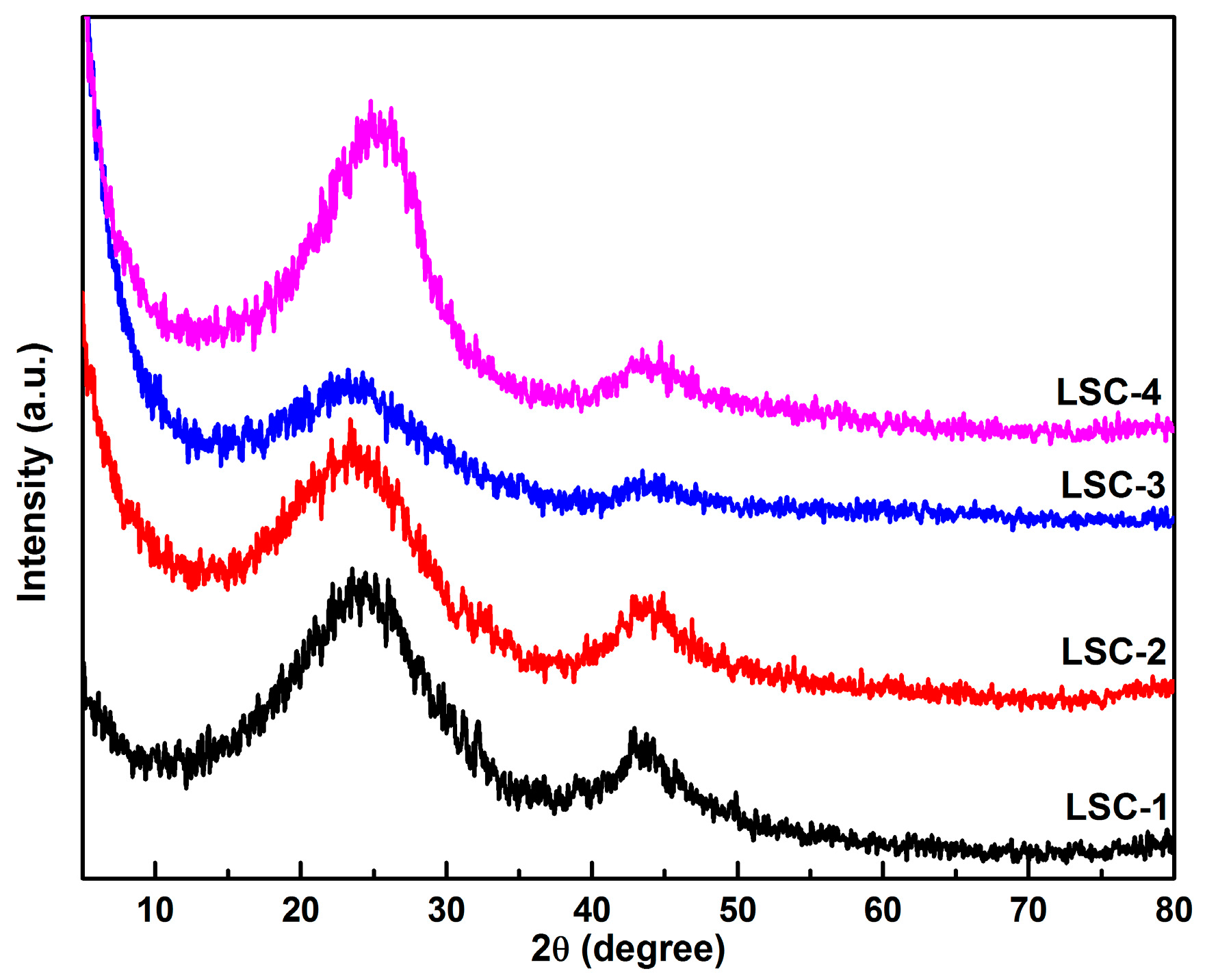 The XRD patterns of the four porous carbon samples reveal the absence of sharp and strong peaks (as shown in Figure 1), indicating the amorphous state of all the LSC samples. On one hand, one broad peak located at about 23° and a weak peak located at 44° were the characteristic peaks of amorphous graphitic carbon, suggesting a limited degree of graphitization of LSC samples. On the other hand, the appearance of the weak peak centered at 44° indicated the improvement of the electrical conductivity. Especially, a slightly sharper peak observed at 44° for LSC-1 suggested the enhanced graphitization degree of LSC-1 compared with the other samples.