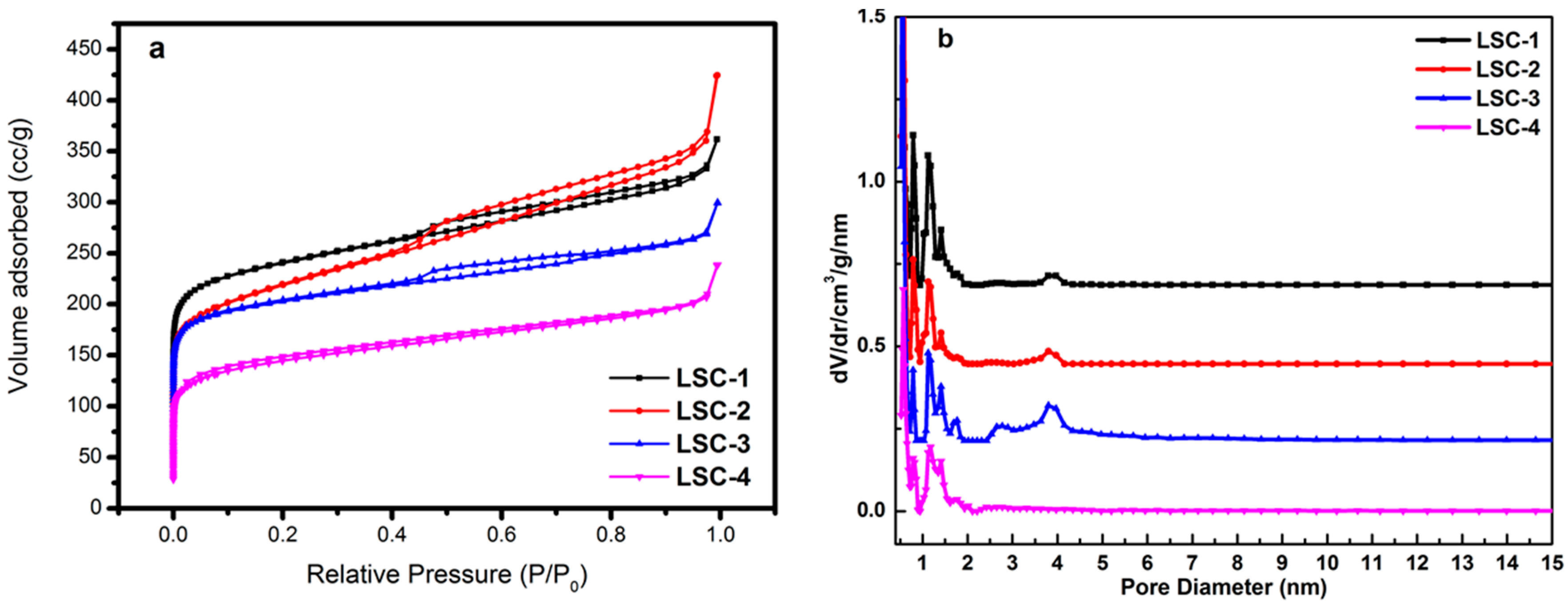 (a) Nitrogen adsorption–desorption isotherms and (b) pore size distributions of of LSC samples.