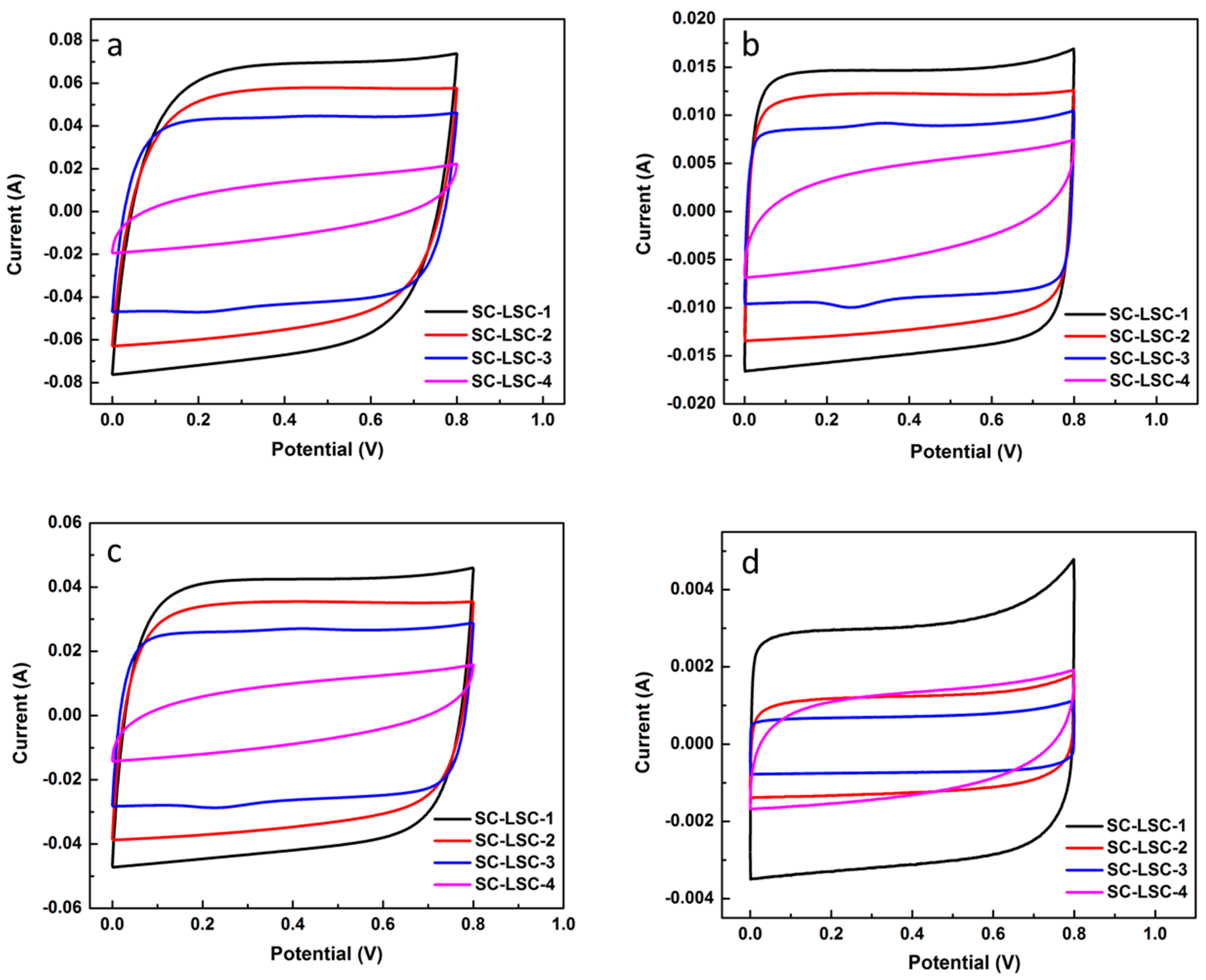 Cyclic voltammetry (CV) curves of LSC-based supercapacitors (SC-LSCs) at different scan rates (mV·s−1): (a) 20; (b) 100; (c) 300; and (d) 500.