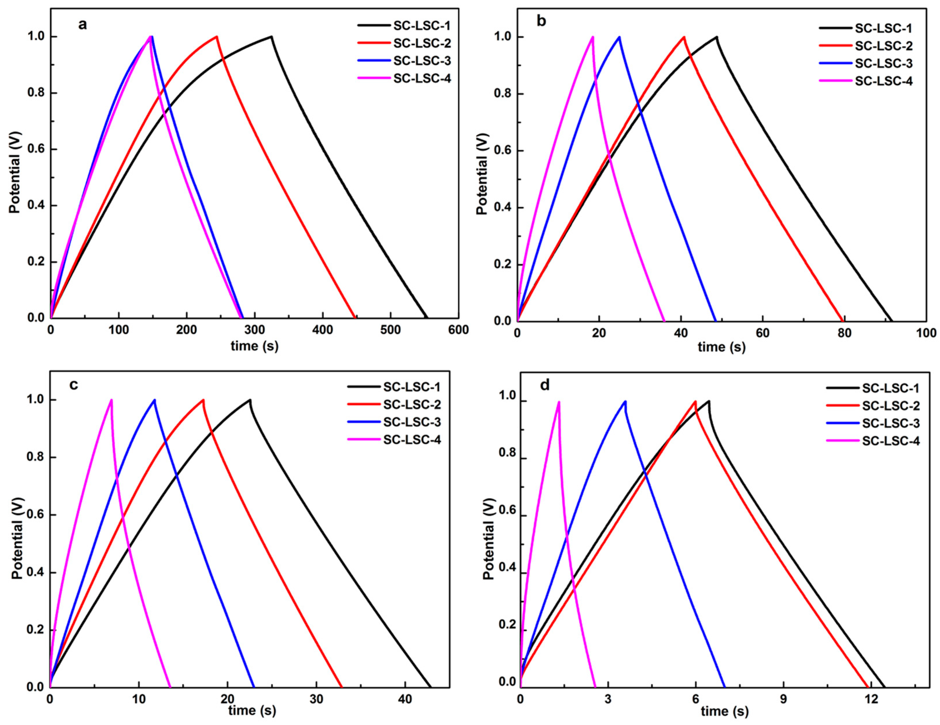 Galvanostatic charge–discharge (GCD) curves of SC-LSCs at different current densities (A·g−1): (a) 0.1; (b) 0.5; (c) 1; and (d) 3.