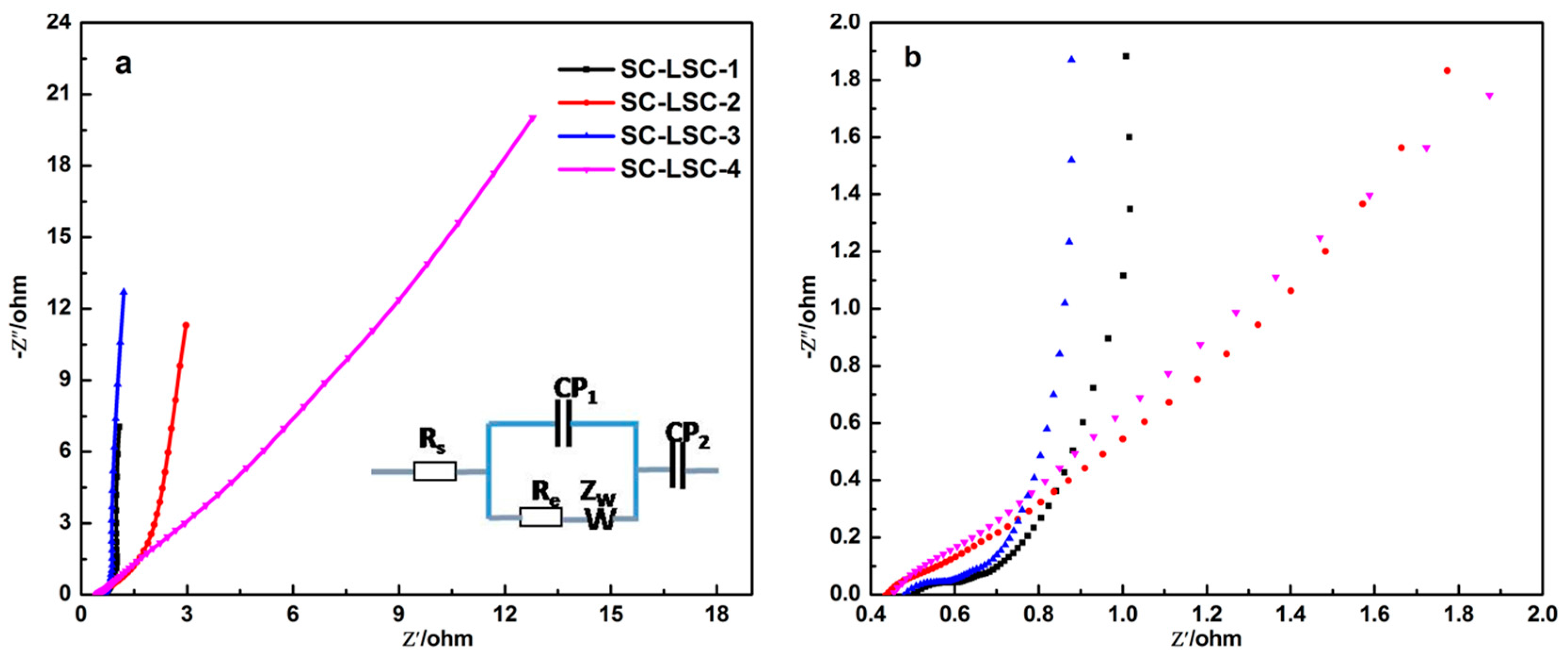 (a) Nyquist plots of four types of SC-LSCs in the frequency range of 0.01 Hz to 100 KHz under open circuit potential conditions and (b) the magnified profile. The inset in (a) is the equivalent circuit of Nyquist plots.