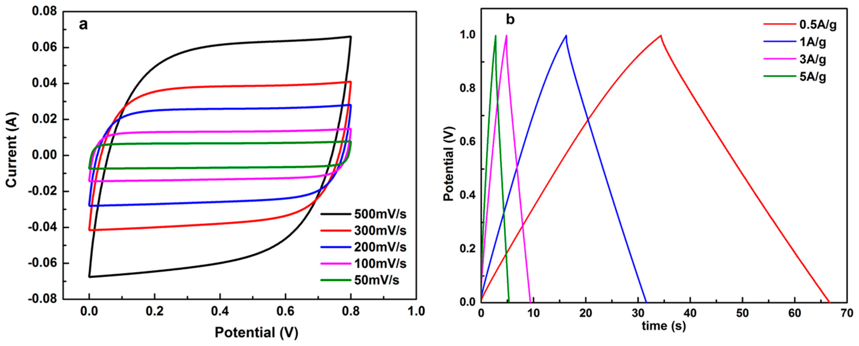 The GCD curves of all the SC-LSCs are shown in Figure 4, the electrodes of which show a typical triangular shape, although imperfect symmetry with a small IR drop. According to the discharging profiles (Figure 4a), based on the charge–discharge curves, the specific capacitance of LSC samples can be calculated by the following formula:
