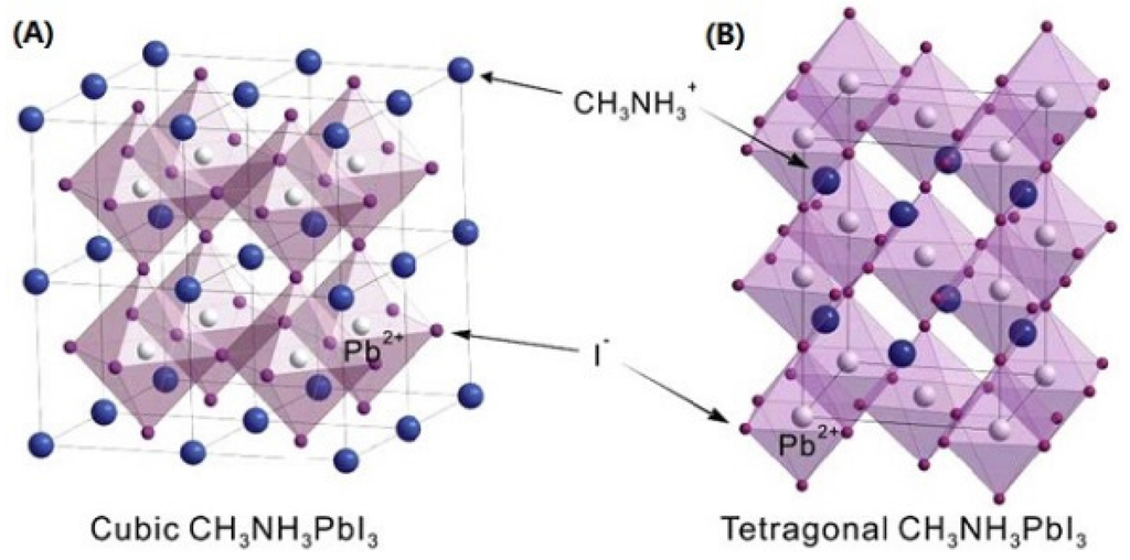 (A) Atomic models of MAPbI3 with cubic phase; and (B) tetragonal phase; (C) the calculated XRD patterns for MAPbI3 in both phases. (A) and (B) are reprinted from reference [64], Copyright © IOP Publishing. Reproduced with permission. All rights reserved; (C) is reprinted from reference [65], Copyright © 2013, Royal Society of Chemistry.