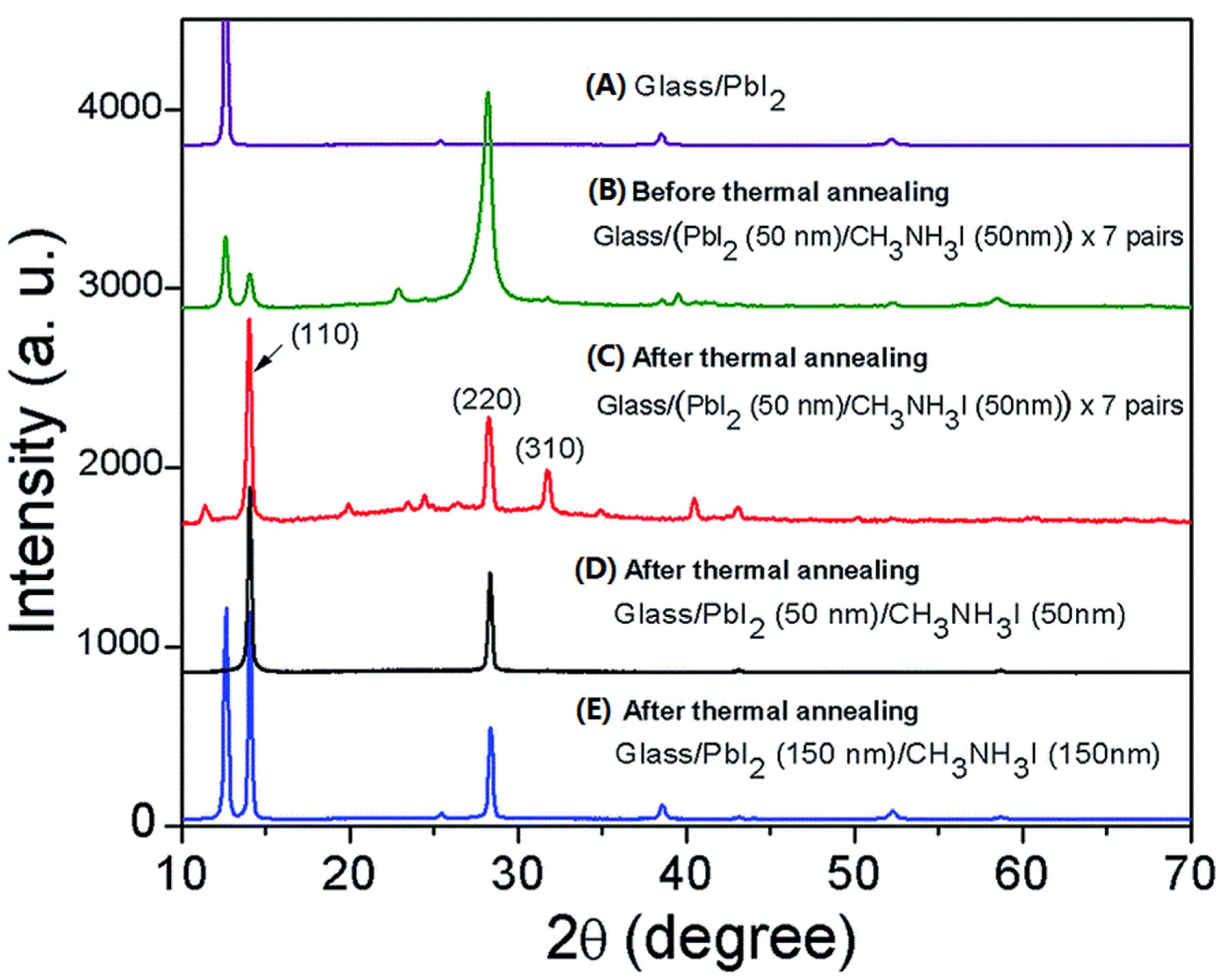 XRD patterns of glass substrates with vapor deposition of (A) a layer of PbI2; and (B) a layer of PbI2 followed by a layer of MAI, repeating this step 7 times; XRD pattern of the (C) annealed 7-time deposited PbI2/MAI layer; (D) 1-time deposited PbI2 (50 nm thickness)/MAI (50 nm thickness) layer; and (E) 1-time deposited PbI2 (150 nm thickness)/MAI (150 nm thickness) layer. Reprinted from reference [77], Copyright © 2015, Royal Society of Chemistry.