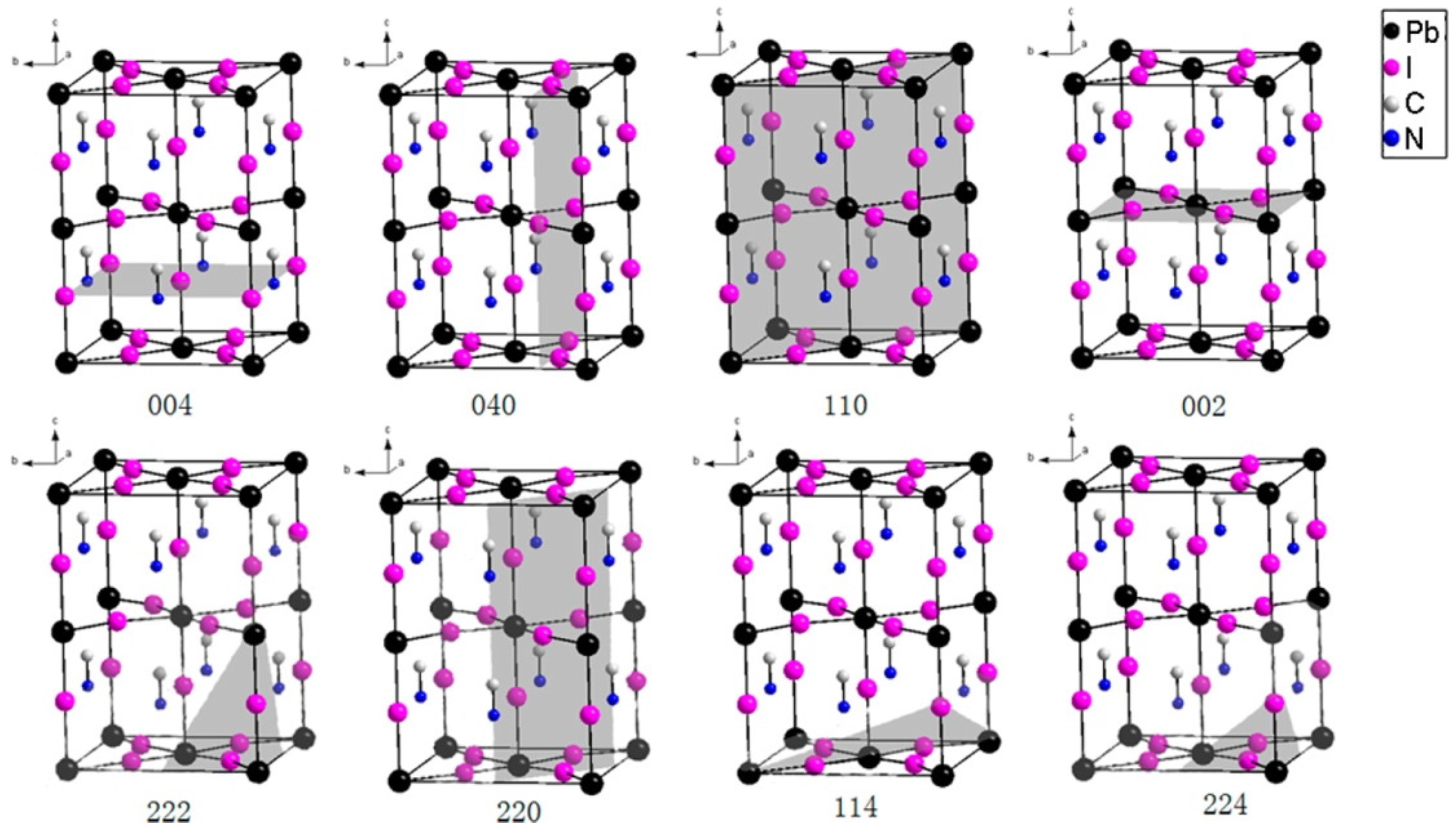 At the beginning of the reaction of PbI2 and MAI, a predominant peak at (220) appeared (as shown in Figure 2B). In other words, the MAPbI3 preferentially grows along (220) plane at first. The annealing process increases the long range crystalline order and results in the predominant (110) peak instead. Noting the (220) is only a short range of (110), thus, another possible reason for the (110)-oriented growth of MAPbI3-xClx and MAPbI3 may be because layered crystal structure of PbI2 (growth along (001) planes of PbI2 like the liquid catalyst cluster model mentioned in reference [76]). The lattice planes of tetragonal MAPbI3 are showed in Figure 3.