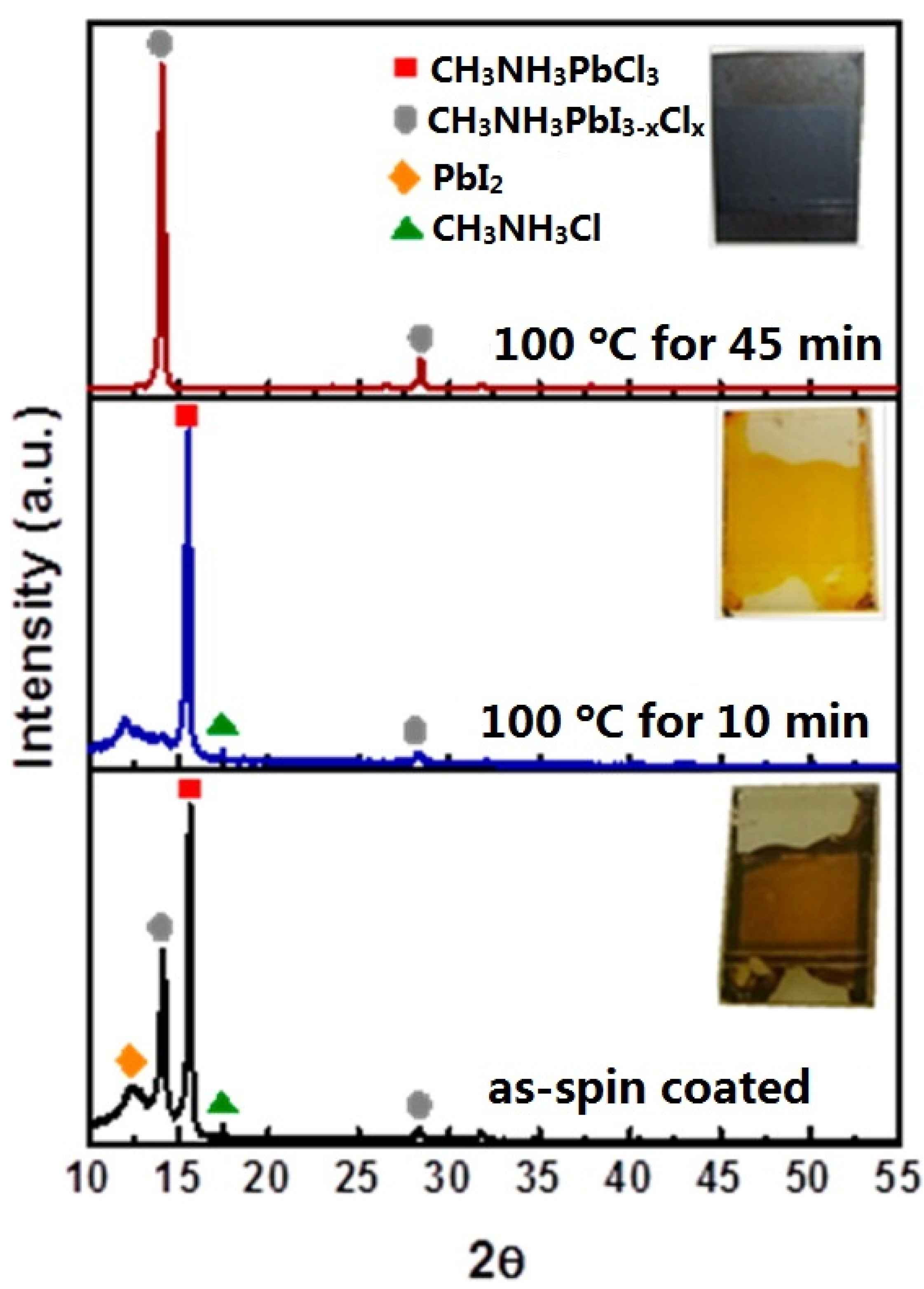 Detail information about crystal formation process of MAPbI3 is summarized in reference [85]. For MAPbI3-xClx, the transformation from the intermediate phase to the perovskite is determined as 80 °C by in situ grazing incidence wide-angle X-ray scattering (GIWAXS) [86]. Figure 4 presents a clearer picture of the crystal formation of MAPbI3-xClx. The 15.7° and 31.5° peaks are associated with the (100) and (200) diffraction peaks of MAPbCl3 [82]. These peaks were also observed in references [27,87,88]. In Figure 4, it is interesting to note that MAPbI3 was formed first for the as-spin coated film but converted to MAPbCl3 after annealing at 100 °C for 10 min, and then MAPbCl3 was converted back to MAPbI3 after 45 min of annealing [84]. Further annealing would result in the decomposition of MAPbI3 to PbI2, but this occurred after conversion to the intermediate phase to MAPbI3 [89]. Because MAPbCl3 is in a cubic phase, we suppose that MAPbCl3 may cause a template effect for the cubic MAPbI3 phase.