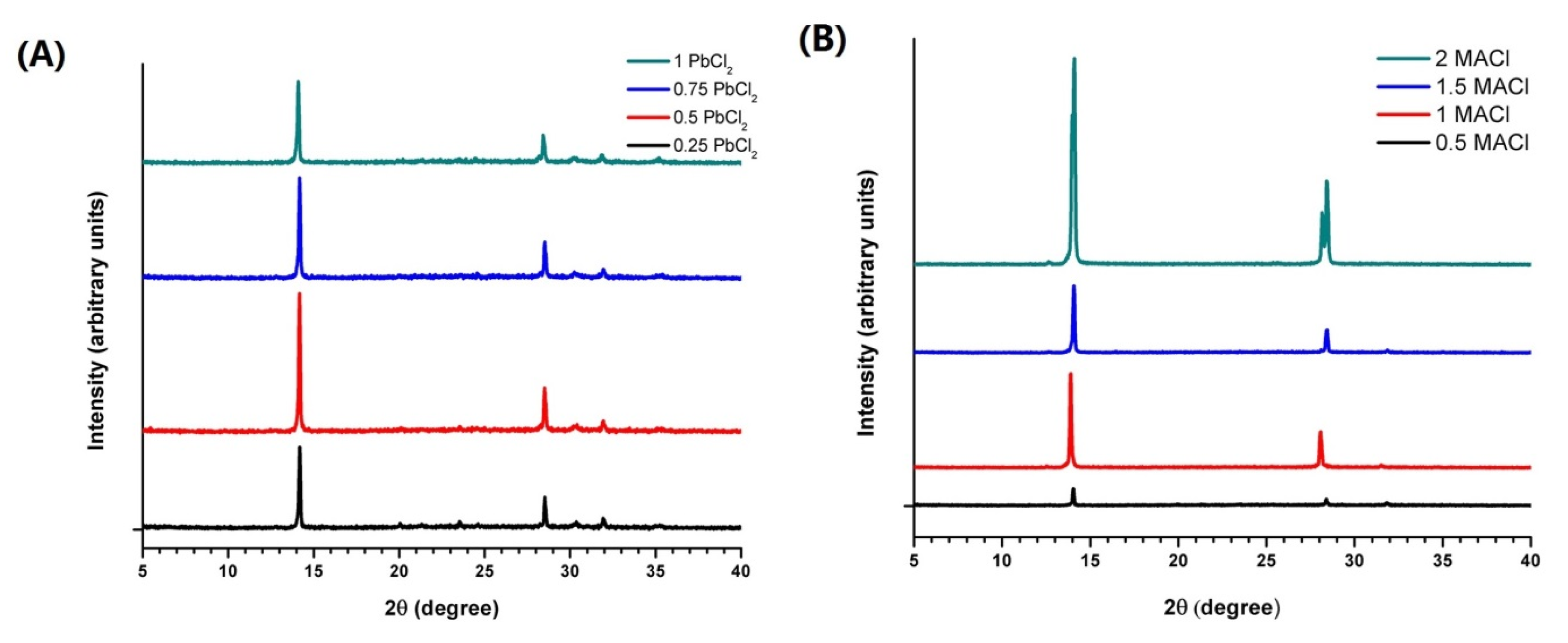 XRD patterns of MAPbI3-xClx prepared from (A) precursor solution xPbCl2+yPbI2+zMAI (x = 0.25, 0.5, 0.75 and 1; y = 1 − x; z = 3 × x + y) in DMF; and (B) precursor solution 1PbI2+1MAI+xMACl (x = 0.5, 1, 1.5 and 2). Reprinted from reference [27], Copyright © 2014, American Chemical Society.