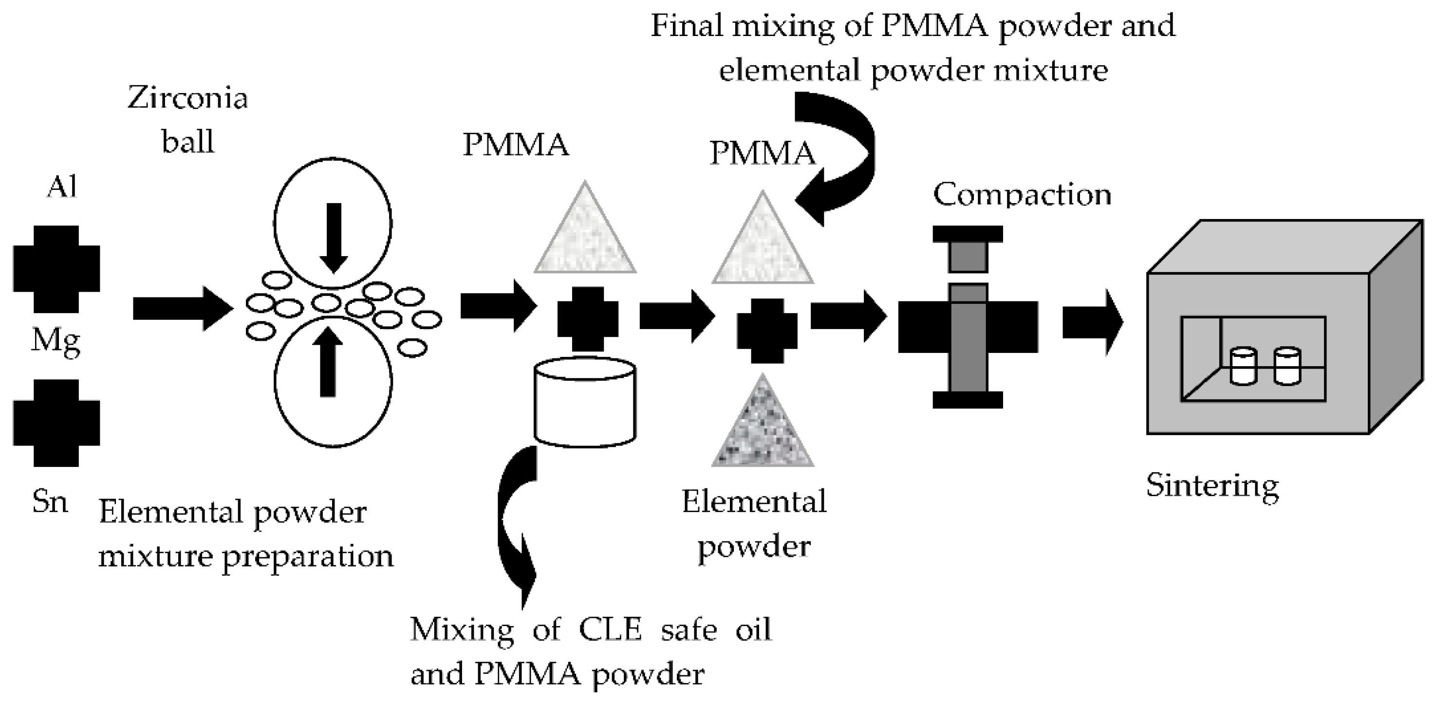 Porous Al was prepared according to a simplified schematic flow diagram as shown in Figure 1, which consisted of mixing, compaction, sintering of compacted specimen and space holder removal stages. Firstly, the mixing of the elemental powder mixture consisted of Al, Mg and Sn was performed in a table-top ball mill with the powder-to-ball (Zirconia) ratio of 1:10 for 12 h. Prior to final mixing, a drop of CLE safe oil was added into the PMMA powder and mixed in a rotary miller for 1 h to promote the adhesion of elemental powder mixture on PMMA particles and to create uniform agglomerates. After that, the final mixing of the elemental powder mixture and the PMMA powder was carried out in a tubular shaker for another 1 h and the final powder mixture was then cold compacted in a cylindrical die of 10 mm in diameter and 12 mm in height at an applied pressure of 250 MPa. After cold compaction, the compacted specimen was first sintered at 450 °C for 1 h to remove the PMMA (space holder) content, followed by sintering of the specimen at 580 °C for 2 h under Argon ambient to obtain pure porous Al body. The sintered porous Al specimen was then washed with acetone and dried in an electrical oven at 90 °C overnight to remove impurities prior to characterization.
