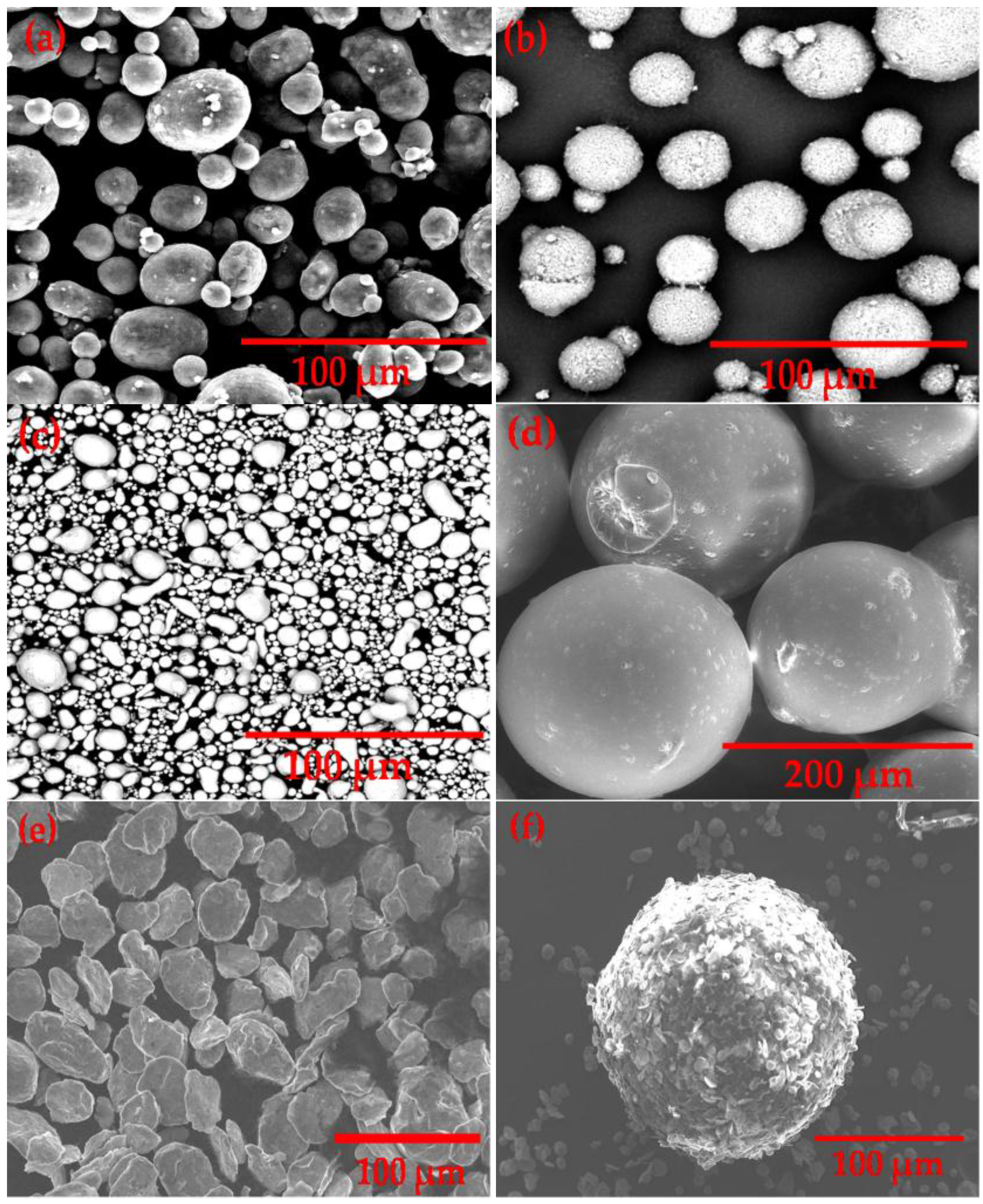 SEM micrographs of (a) Al powder; (b) Mg powder; (c) Sn powder; (d) PMMA particles; (e) elemental powder mixture after 12 h of mixing and (f) coating of elemental powders on the surface of space holder particle (PMMA).