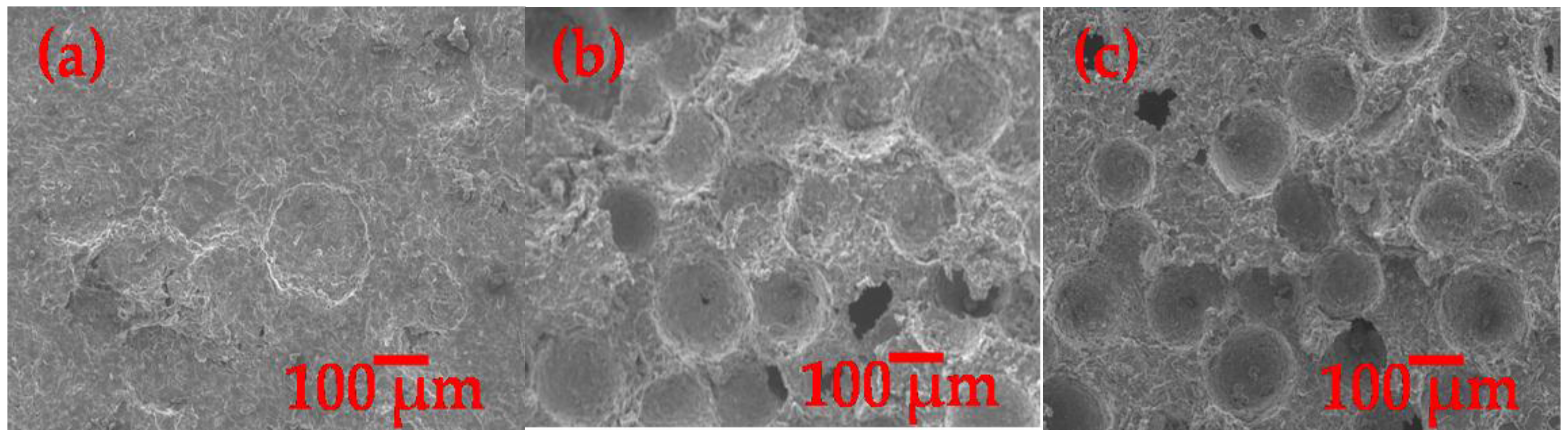 Figure 4a–c reveals the SEM micrographs of the resultant porous Al with 20 wt %, 25 wt % and 30 wt % of PMMA. It can obviously be seen that the pores in the resultant porous Al were mainly composed of closed macro-pore structure, especially in the case of 25 wt % and 30 wt % of PMMA. However, in comparison to Figure 4b,c, the appearance of pore formation was hardly seen on the porous Al with 20 wt % of PMMA (Figure 4a) due to the development of a dense cell wall, showing that 20 wt % of PMMA content was insufficient to create the desired closed pore structure in the porous Al. It is demonstrated that the macro-pores of the porous Al are obtained by the removal of the space holder particle and largely depend on the size and shape of the space holder particle [5]. As evident in Figure 4b,c, these macro-pores were found to be homogeneously distributed in the resultant porous Al and were isolated from each other by a distinct cell wall (average thickness of 51.11 μmin the case of 25 wt % PMMA and 45. 87 μm in the case of 30 wt % PMMA), further corroborating the formation of closed-cell structure in the resultant porous Al [31]. The morphology of these closed macro-pores were also observed to replicate the initial morphology of the spherical PMMA particle. The average pore size was around 159 μm, which is almost equal to the size of PMMA particle. Studies have shown that it is important to ensure that the pore formation resembles the morphology of space holder material in obtaining porous Al with better quality. Zhang et al. revealed a decline in compressive strength and elastic modulus of porous polymeric due to irregular pores formation prior to asymmetrical shape of space holder material [32]. Similar findings were also found in the study of Bekoz and Oktay, in which higher compressive properties of porous Al were obtained with the use of spherical spacer holder material as compared to the irregular one [33]. On the other hand, only a few micro pores were observed in the cell wall of porous Al as shown in Figure 4b,c and this is probably due to incomplete sintering of the Al particle. In the present study, the formation of the highest quantities of pores was obtained on the porous Al with the highest content of PMMA (30 wt %), followed by 25 wt % and 20 wt % of PMMA contents as seen in Figure 4a,c. From these findings, it is reasonable to infer that the fabrication of closed-cell porous Al using PMMA as the spacer is practically feasible, and porous Al with higher porosity can be obtained by increasing the weight percentage of PMMA particle.