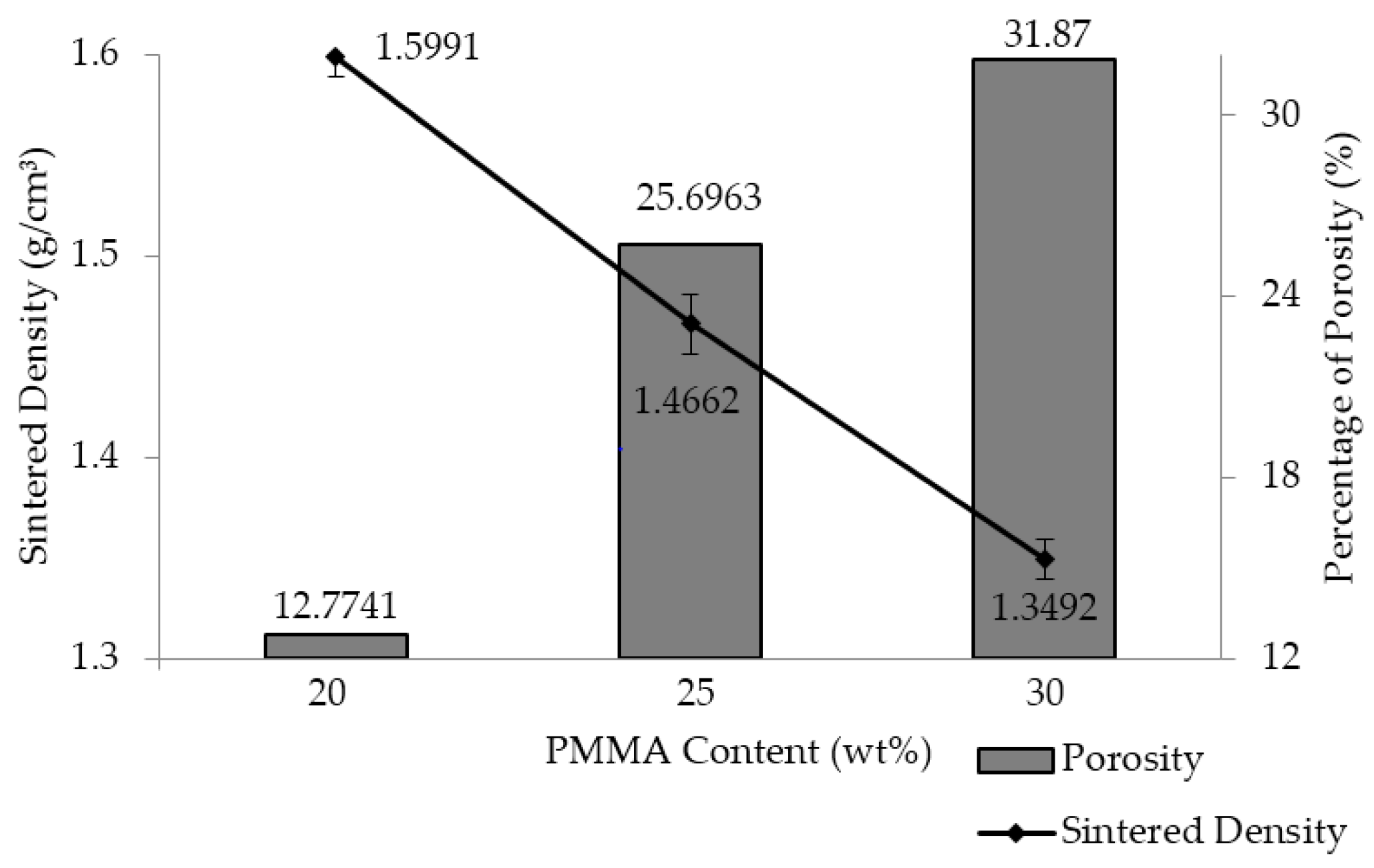 Figure 5 shows the sintered density and porosity of the as-produced closed-cell porous Al with different PMMA content. It can be observed that the sintered density of the porous Al decreased, and the porosity of the porous Al increased with increasing PMMA content. The sintered densities of the porous Al decreased from 1.6478 g/cm3 to 1.305 g/cm3 when the PMMA content was increased from 20 wt % to 30 wt %. In contrast, the porosity level of the porous Al increased from 12.77% to 31.87% as the content of PMMA was increased from 20 wt % to 30 wt %. Clearly, the addition of PMMA particle as the space holder material during fabrication reduced the density of the porous Al and consequently increased the porosity of the porous specimen. This can be attributed to the fact that a higher volume of closed pores is created when the PMMA content is higher. In this technique, the closed pores in the porous Al were created through the thermal decomposition of PMMA particles during sintering. Therefore, more closed pores were created as more content of PMMA was added, making the porous specimen possess higher porosity and become lighter. Similar observation was documented in the study of Manonukul et al. [11]. This observation is also in good agreement with our results obtained from the microstructural characterization as revealed in Figure 4a–c, in which a higher number of closed pores with thinner cell walls were found with increasing content of PMMA particles. It is therefore clear that the sintered density and porosity of the porous Al can be tailored by varying the content of the space holder material.