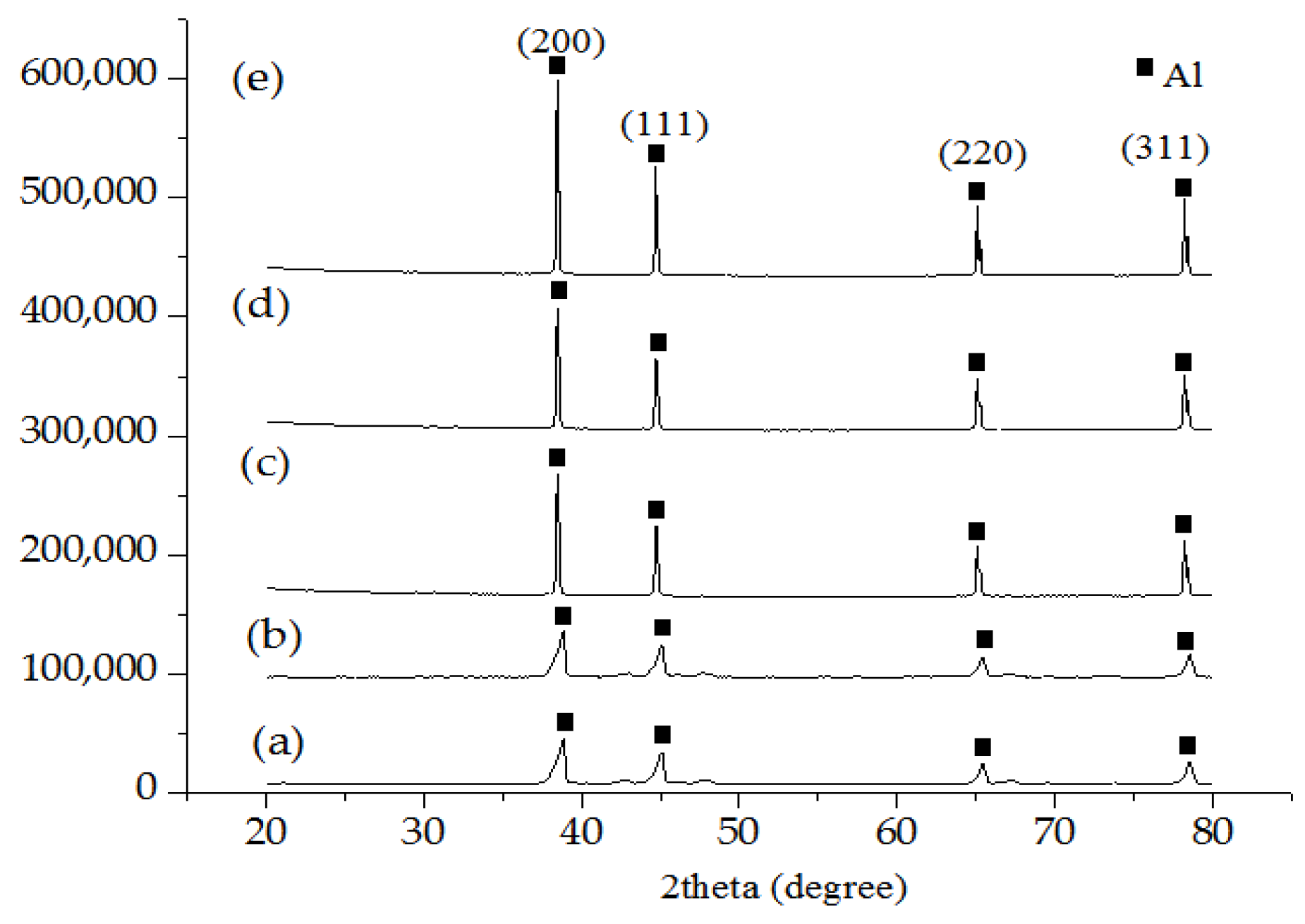 XRD patterns of (a) elemental powder mixture; (b) final powder mixture; (c) porous Al with 30 wt % PMMA content; (d) porous Al with 25 wt % PMMA content; and (e) porous Al with 20 wt % PMMA content.