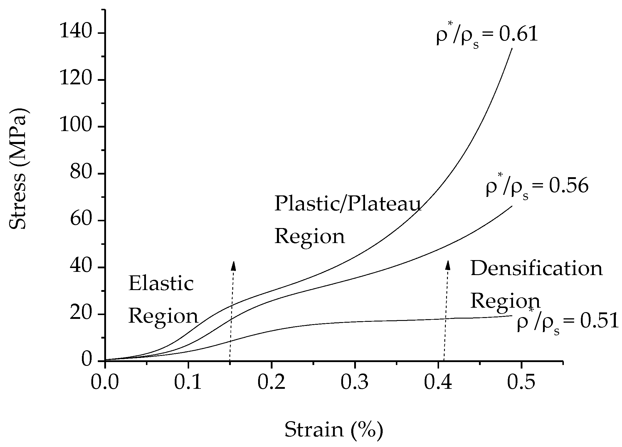 As illustrated in Figure 7, the plateau stress increased with increasing relative density. Due to the presence of the denser cell wall, higher buckling and bending deformation resistance of the cell walls are required during the elastic deformation, and thus porous Al with 20 wt % of PMMA content (relative density of 0.61) exhibited the highest plateau stress. In contrast, porous Al with 30 wt % of PMMA (relative density of 0.51) displayed the smallest plateau stress because elastic deformation may easily occur as a result of higher porosity of porous Al, resulting in reduction in the plateau stress. Similar findings were also reported previously [3,40].