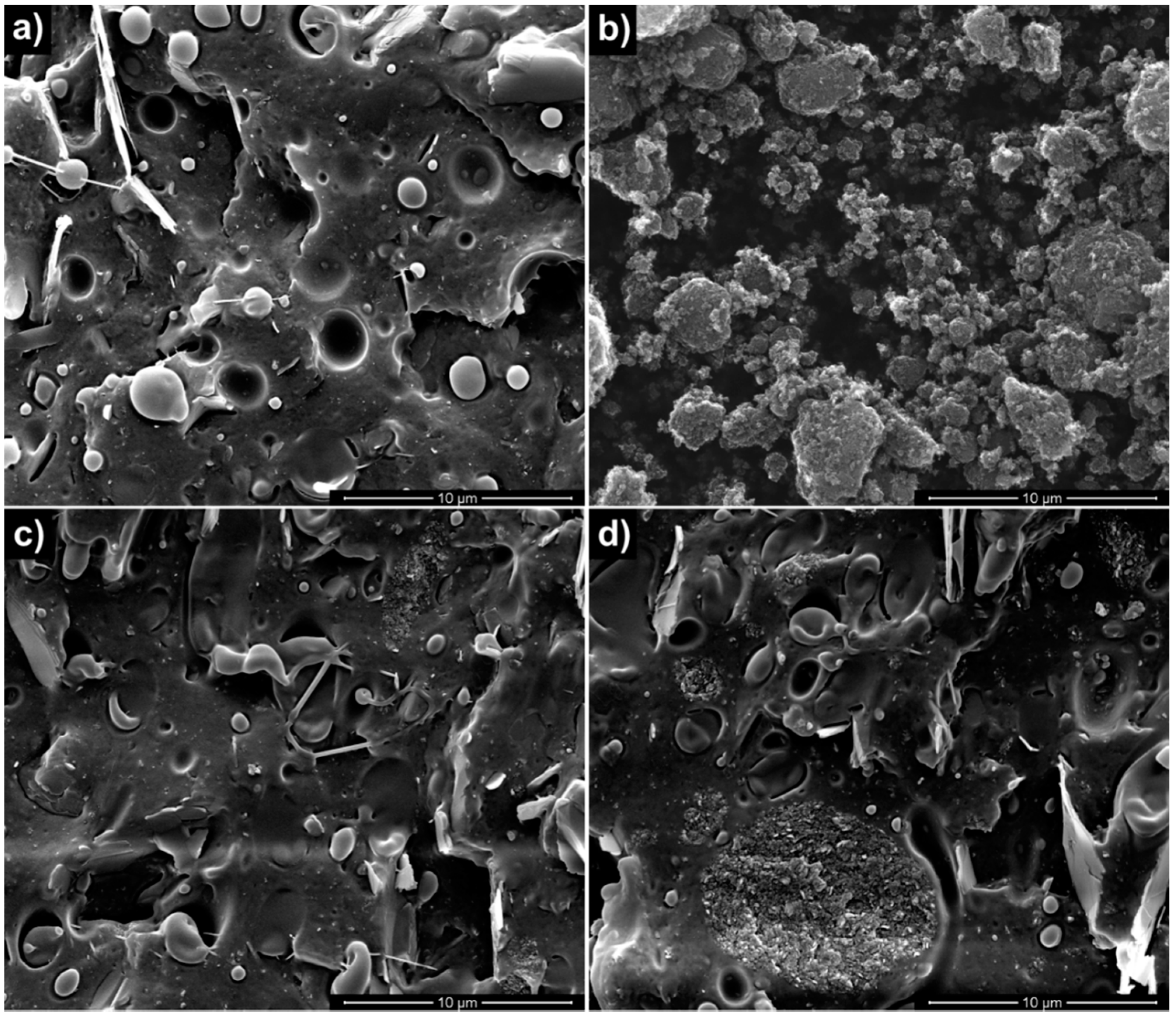 SEM micrographs of the neat polymeric matrix, of the GnPs, and of the nanocomposite systems are reported in Figure 1. The surface fracture of neat BIO (Figure 1a) exhibited the typical morphology of polymer blends showing a poor interfacial adhesion, evidenced by the presence of voids due to the detachment of the copolyester phase from the PLA matrix during the sample breaking. The SEM micrograph of neat GnPs powder (Figure 1b) revealed irregular aggregates having different dimensions. BIO/GnP-1 (Figure 1c) showed a fairly good dispersion of the GnPs and a good adhesion between the matrix and the filler. As expected, upon increasing the filler concentration, the aggregates visible in the fracture section increased, although a good adhesion was still evident (Figure 1d).