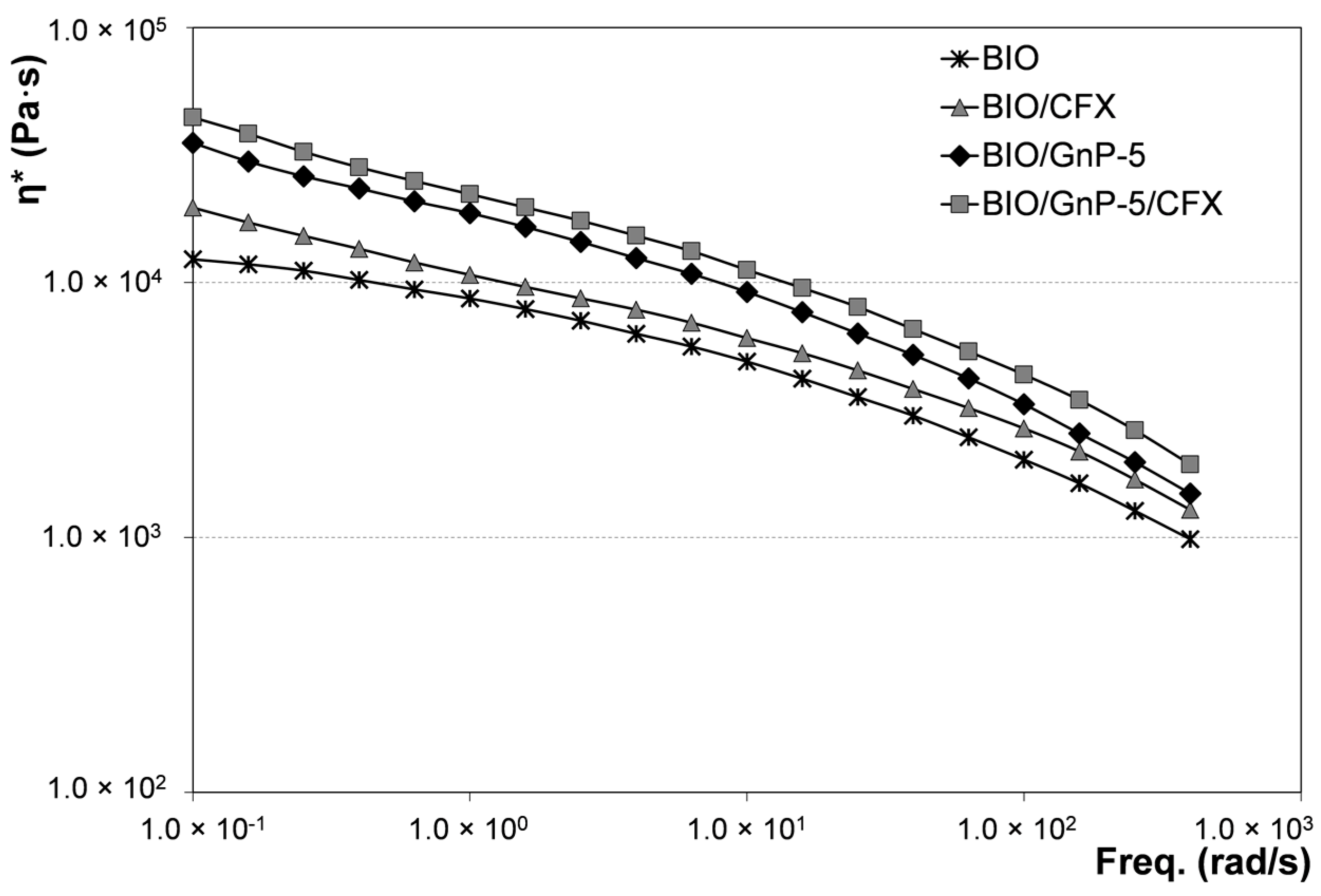 Complex viscosity as a function of frequency of neat BIO and related nanocomposites.