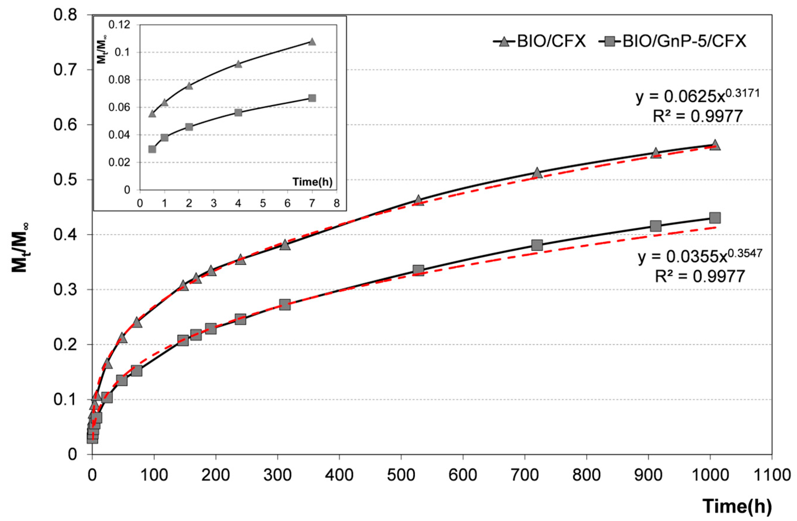 Cumulative CFX release from BIO/CFX and BIO/GnP-5/CFX. In the inset, only the first hours of release are plotted in order to enhance their readability. The power trend-lines fitting the experimental data (red dashed lines) are reported in the graph together with the respective equations and the R2 values.
