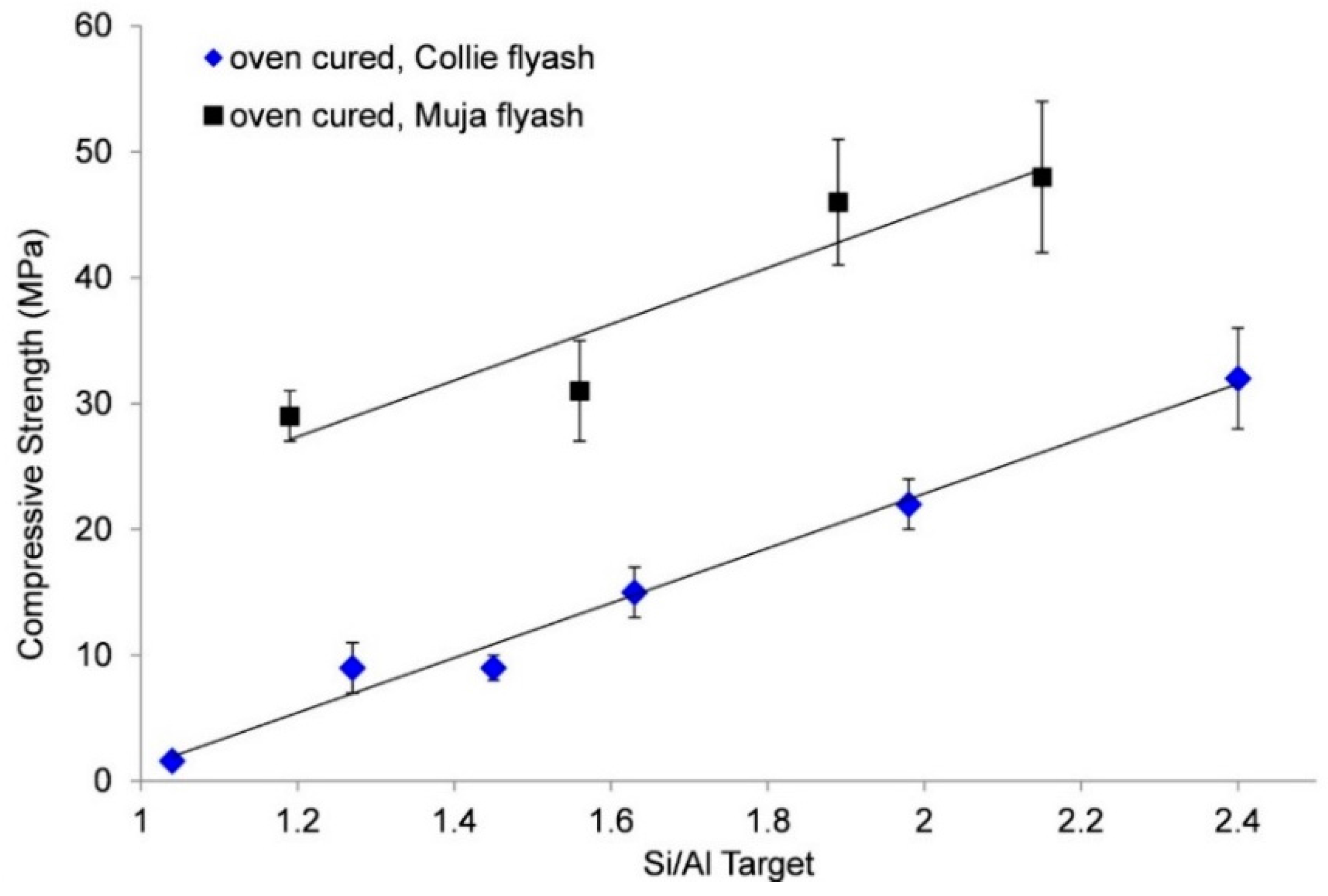 Silica fume was added to geopolymer paste mixes to achieve targeted Si/Al ratios. The addition of silica fume reduced the workability of the mixture. Geopolymer samples made from Collie or Muja fly ash were oven cured at 70 °C for 24 h in a sealed vial. Figure 2 shows a linear relationship between the targeted Si/Al ratio and the compressive strength.