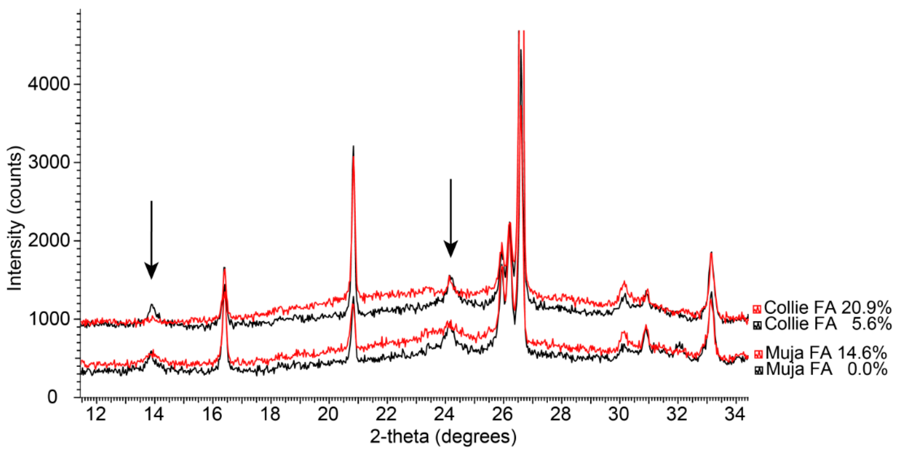 A comparison of the XRD patterns (11°–35° 2θ) collected from Collie and Muja fly ash geopolymers with varying levels of silica fume. Note: The patterns have been offset vertically to improve clarity. The oven-cured samples were cured for 24 h at 70 °C. The most intense reflections of the sodalite phase are highlighted with arrows.