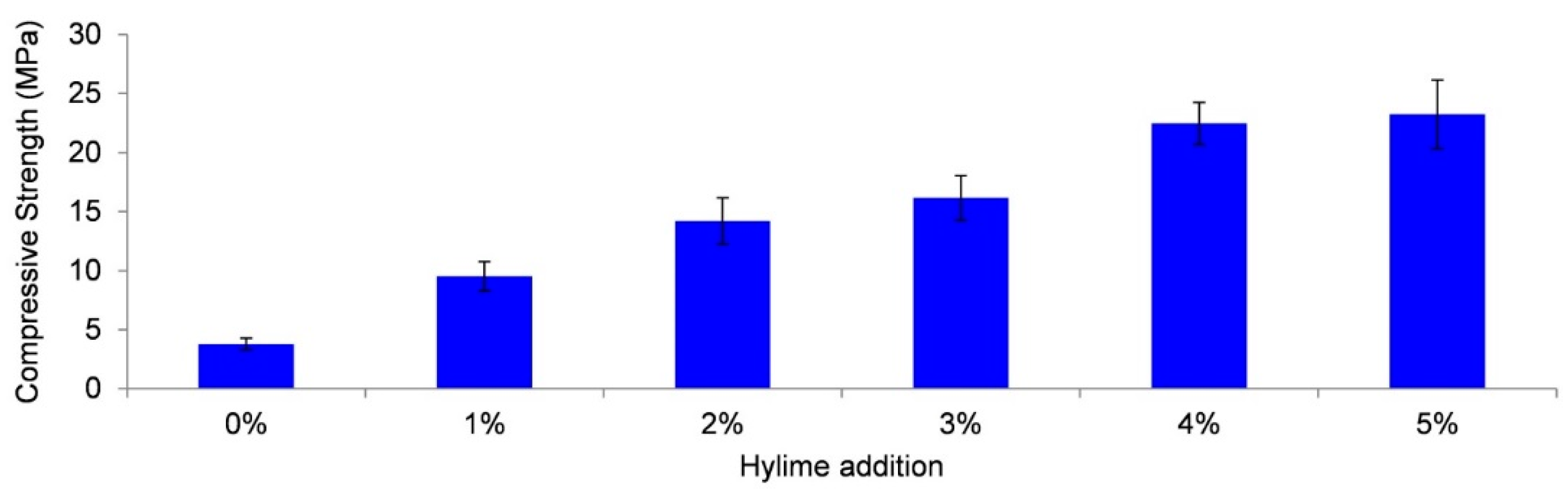 Seven-day compressive strength results for ambient cured Collie fly ash/Bayer liquor geopolymer samples with increasing Ca(OH)2 (Hylime) content (wt %).