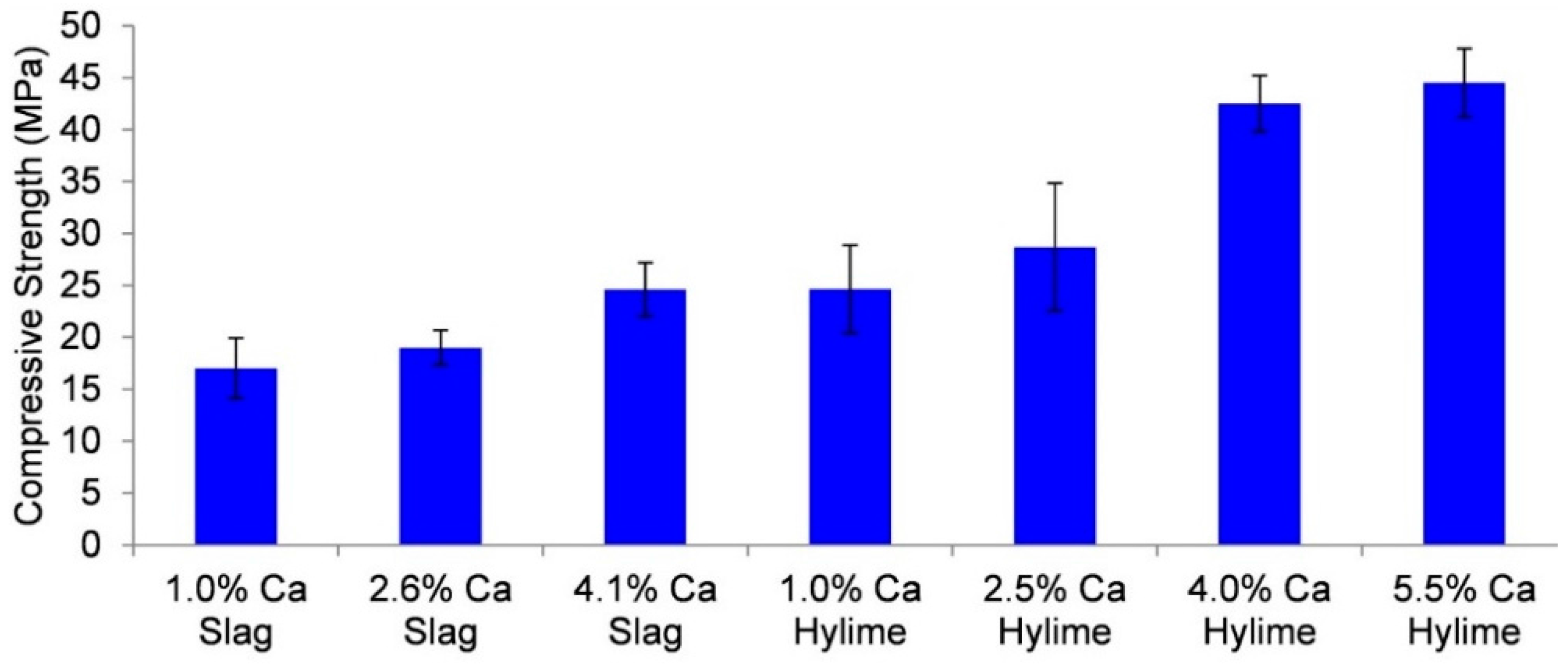 Samples of Collie fly ash/Bayer liquor geopolymer were produced with different levels of Hylime (Ca(OH)2). Figure 5 shows the seven-day compressive strength for samples cured at ambient temperature (approximately 22 °C). The strength increases with increasing Ca(OH)2 content with mixtures of 4 wt % or higher Ca(OH)2 achieving the desired level (>20 MPa).