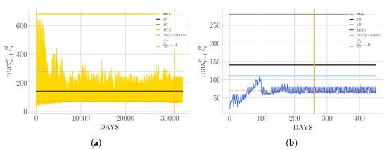 Snapshot of the evolution of maximum heights when strategies: (a); (b); (c); and (d) are applied on an instance having and . (in details, structured as follows ). On the x-axis the consecutive days are reported while on the y-axis the maximum height on the corresponding day is plot. The vertical line shows the beginning of the periodic phase while the horizontal lines show, respectively, (i.e., H), , , and over the entire execution.