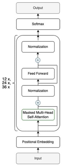 The model was trained to predict the next token using the previous sequence, similar to the RoGPT2 [] training for the Romanian language. The model architecture consists of several decoder layers of architecture Transformers [], as presented in Figure 1. There are 3 versions of the model, each with a different number of decoder layers: 12 layers were used for the base version, 24 layers for the medium version, and 36 layers for the large version.