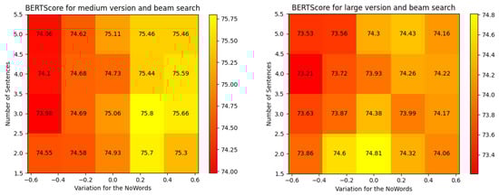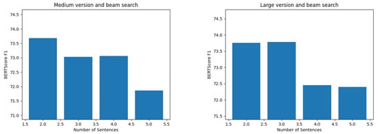 Besides assessing the performance of various configurations, our aim was also to explore the extent to which control tokens change the generated texts. As such, we generated summaries for the same news by varying the values for the control token(s), while assessing the impact on the quality of the generated summary and its resemblance to the original text. Given the previous best results, medium and large RoGPT models with beam search configurations were chosen for this experiment. We experimented with an individual control token (i.e., <NoSenentences>) that is easily explainable, as well as with a more complex scenario that forces a compression/expansion of the generated text (i.e., a combination used of <NoSentences>-<NoWords>). The range for <NoSenentences> was 2–5; there were extremely few training samples with only 1 sentence within the summary, and our model is incapable of generating such over-condensed summaries. The <NoWords> control token considered five values −50%, −25%, 0%, +25%, +50%, which signified a compression of −50% words from the reference summary, all the way to an expansion with +50% additional words. A sample of 100 news articles from the test partition was chosen, and BERTScore was calculated for each value of the control token(s); the corresponding results are presented in Figure 2 and Figure 3. An example of text generation when only the <NoSentence> was varied is presented in Appendix C.1, whereas Appendix C.2 showcases the example for <NoSentence>-<NoWords>.