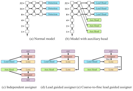 The YOLOv7 framework features a lead head and an auxiliary head that are guided by a label assigner [].