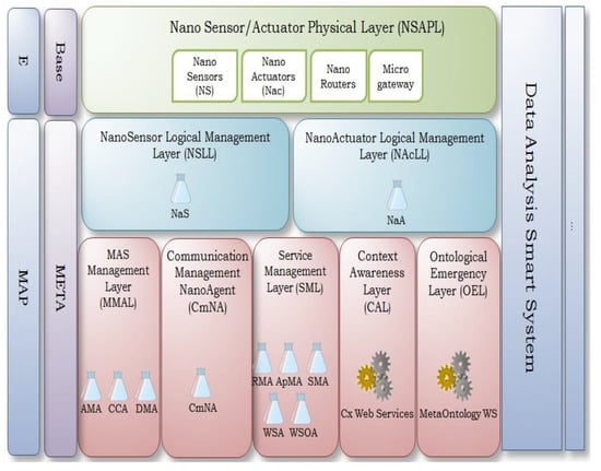 The base-level in ARMNANO is named NSAPL. It contains physical devices such as the NS, NA, Ro, and the microgateway. Then, the abstract views of the nanodevices in the NSAPL layer are deployed as logical agents, called NaS and NaA, in the metalevel. Elsewhere, at the meta-level, ARMNANO has five layers, which are MMAL, CmNA, SML, CAL, and OEL, that provide services with respect to context characterization and cloud connection, among other things.