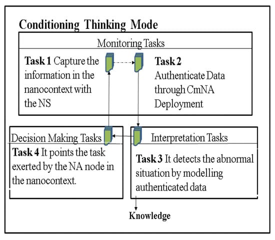 Task 4, Define the action exerted by the NA node in the nanocontext: a command defined by this AC is executed in the DASS, so that the NA node performs the actions. Some of these actions can be delivering medicament, destroying a fatty spot, localized organelle reparation, or cutting a specific internal spot. This node is devoted to only one function, such as cutting, moving, shifting, tapping, etc. The data source is the output of the models generated by the ML techniques in the previous task.