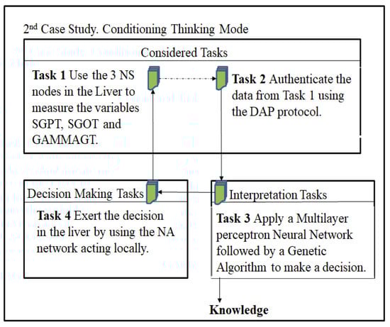 In this work, we study the utilization of ARMNANO for nanodata analysis in the context of eHealth solutions [,]. The ARMNANO middleware will be examined in this publication regarding the data analytics focus. To this end, we employ the Autonomic Cycles (ACs) defined in the Data Analysis Smart System (DASS) [] of ARMNANO []. Herein, the data analysis can be carried out by any of the three ACs, depending on the situation of the context. The three ACs are the Conditioning Thinking Mode (CTM), the Optimizing Thinking Mode (OTM), and the Fixing Thinking Mode [], which define a complete framework for the treatment and analysis of the nanodata collected by the system.