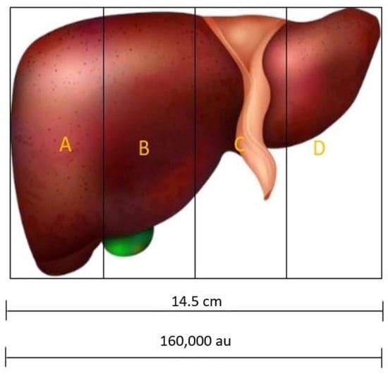 Something interesting to determine is how to implement the NS. For example, in the case of four NSs, considering the best individual, the liver can be divided into four zones (see Figure 5): A, from 0 to 40,000; B, from 40,000 to 80,000 au; C, from 80,000 to 120,000 au; and D, from 120,000 to 156,500. Therefore, each sensor must be injected into these areas to obtain the data from the damaged area.