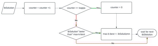 In the max-κ-best strategy, the best solution that was found can be used in up to κ iterations of the algorithm. Then, after κ iterations, if the algorithm fails to find a better solution, it takes the best solution from the last iteration and uses it for pheromone reinforcement. The data structure for this strategy is simple and consists of one solution and one integer type of counter. At the beginning of the algorithm, in the initialization phase, the counter variable should be set to 0. After each iteration, the best solution from that iteration, ibSolution, enters the max-κ-best strategy, as shown in Figure 2. The same as with the κ-best strategy, there are two special cases. The max-1-best is equivalent to the iteration-best strategy, and for κ larger than the maximal number of iterations, this strategy is equivalent to the global-best strategy.