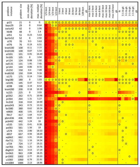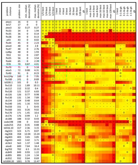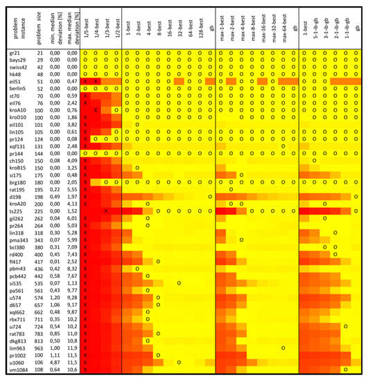 For each problem instance, the best strategy was colored yellow, the worst strategy red, and all the other strategies with shades of colors in between. The best strategy is also marked with the symbol “O” and the worst with the symbol “X”. Strategies that were the best within their own category are marked by the symbol “°”. In some cases, there is more than one best strategy, e.g., MMAS without local optimization achieves a median solution equal to the optimum for gr21 for all strategies, as shown in Figure 3.