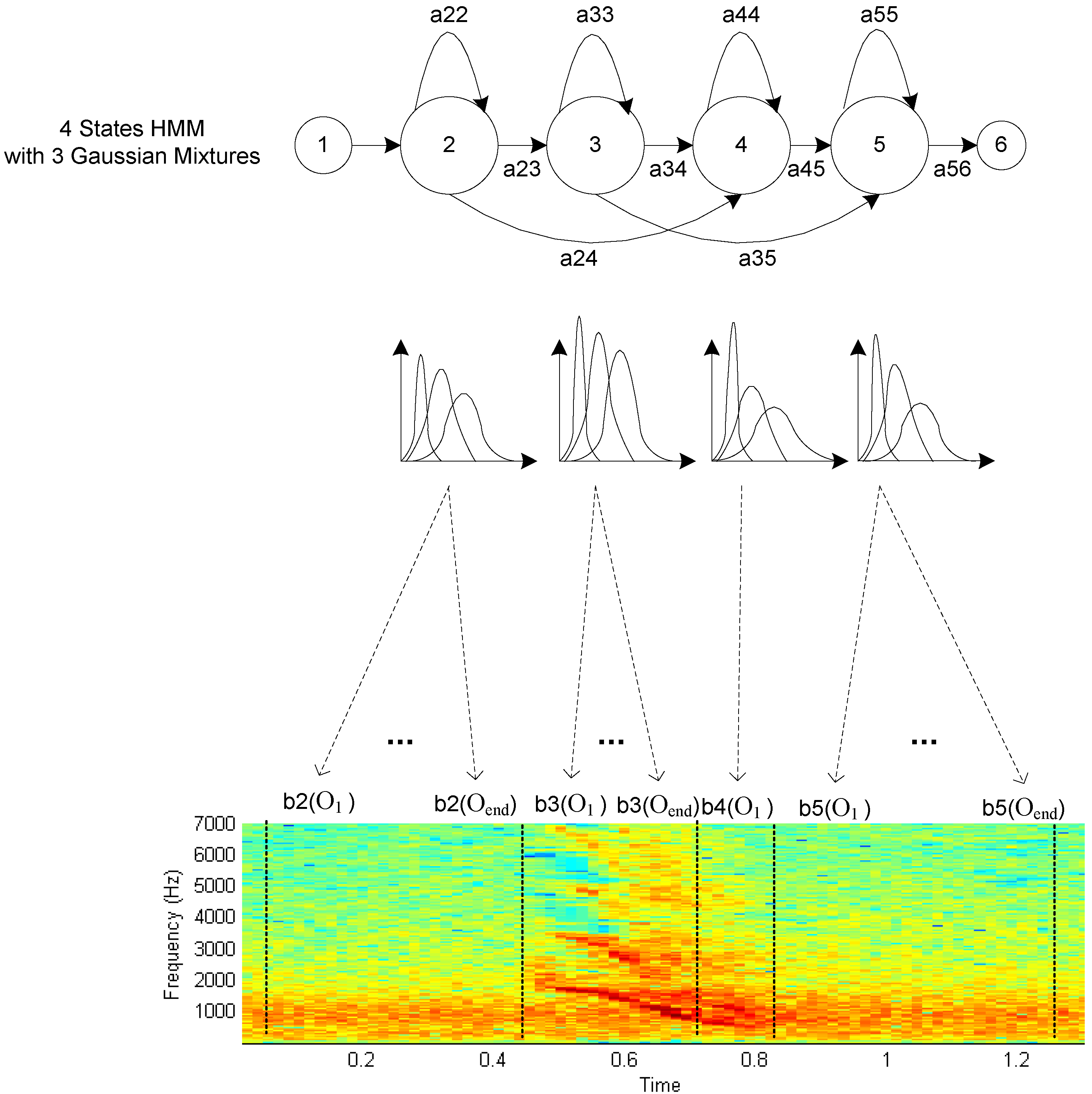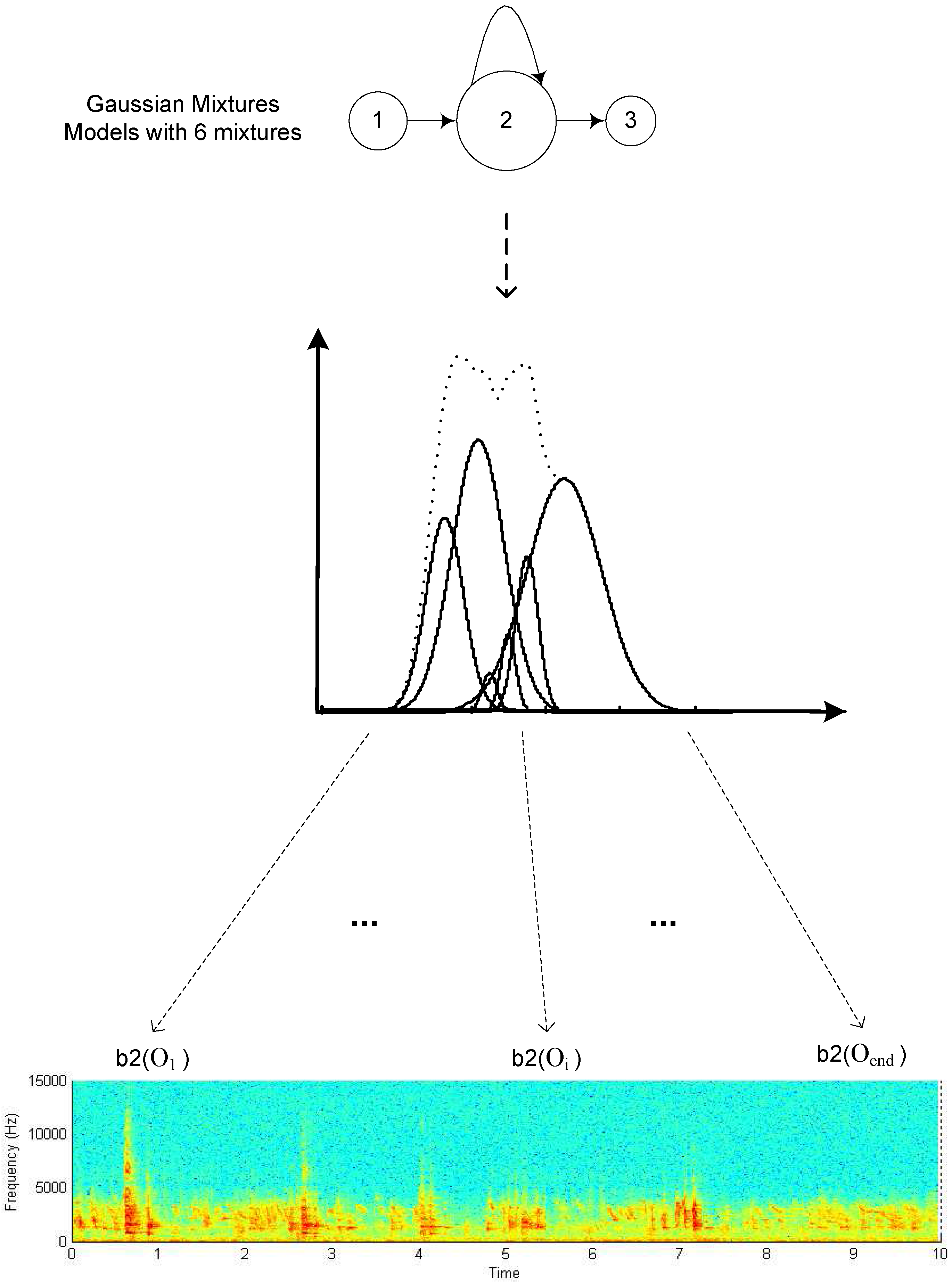 An HMM is defined by its transition matrix A, in which each element ai,j represents the probability of moving from state i to j, and state observation probabilities bi(ot), which represent the probability distributions for each state i. Observations ot represent the data being modeled, in this case the feature vectors of the vocalization frames. Because the transition matrix is two-dimensional, the system has the Markov property, i.e. the probability of the next state is dependent only on the current state. In human speech, Gaussian Mixture Models (GMMs), a weighted sum of Gaussians that can represent a wide variety of unimodal and multimodal distribution characteristics, are commonly used to model the state observation probability densities. The programming toolkit used here is the Hidden Markov Model Toolkit (HTK) from Cambridge University (2002) [23]. Parameter training is implemented using the Baum-Welch method (an implementation of the well known Expectation Maximization algorithm) for maximum likelihood estimation [24,25], and classification is accomplished using the Viterbi algorithm [26] to identify the most likely HMM or HMM sequence given an unknown vocalization.