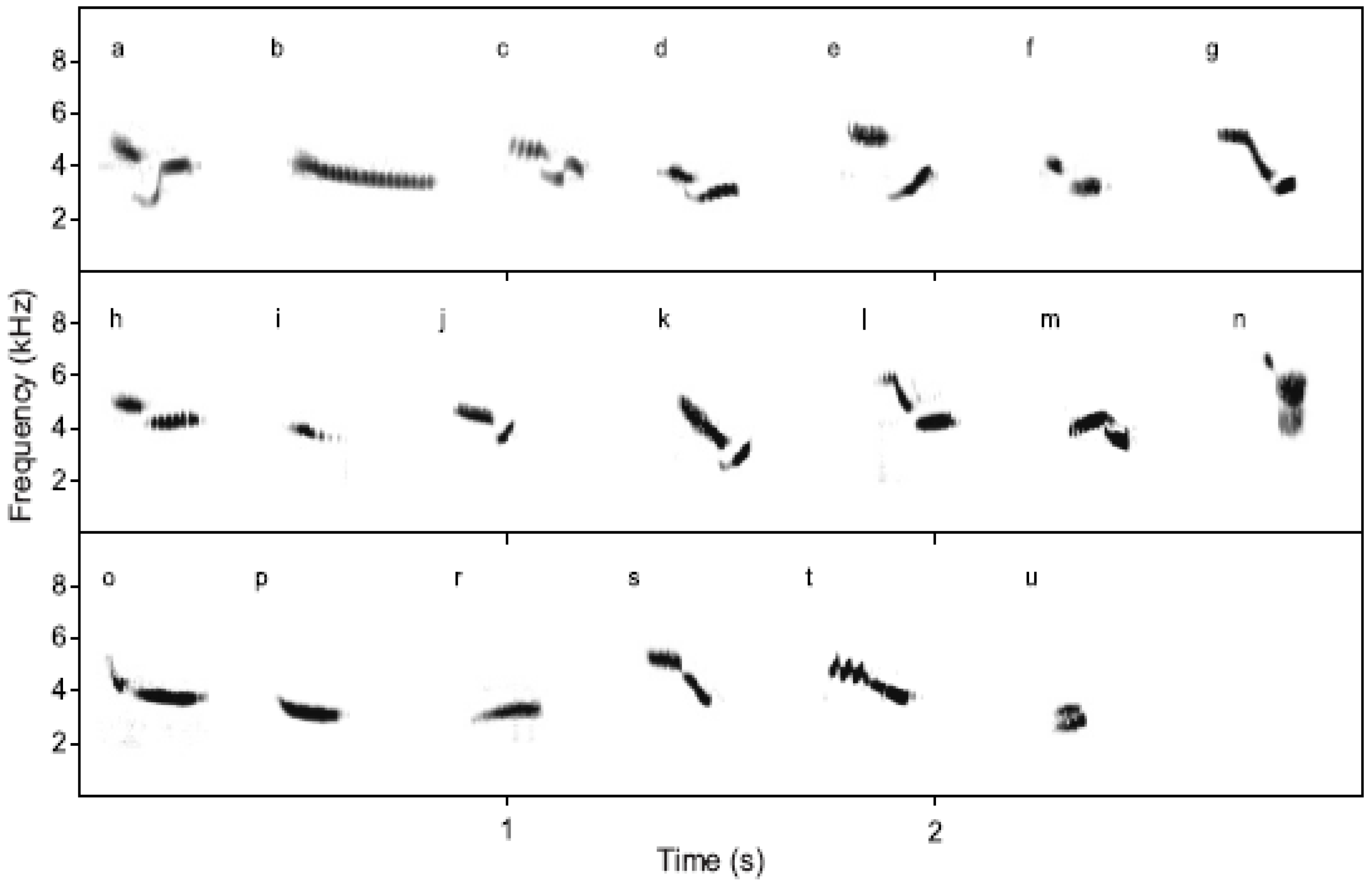 - Clark, C.W.; Marler, P.; Beeman, K. Quantitative analysis of animal vocal phonology: An application to swamp sparrow song. Ethology 1987, 76, 101–115. [Google Scholar] [CrossRef]