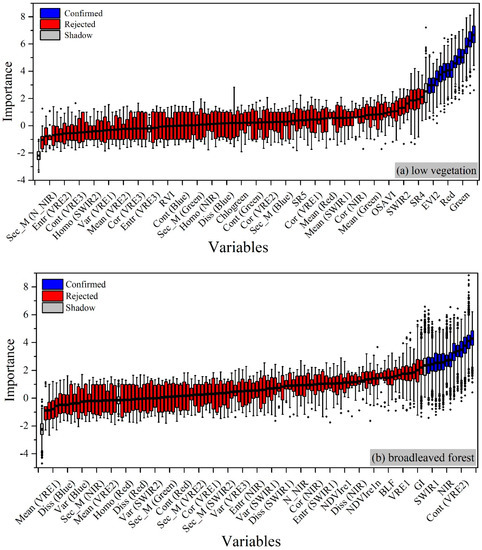 Importance of candidate variables: (a) low vegetation; (b) broadleaved forest; (c) coniferous forest; and (d) all-type vegetation. Important variables are labeled as Confirmed in blue, unimportant ones as Rejected in red, and shadow ones as Shadow in grey.