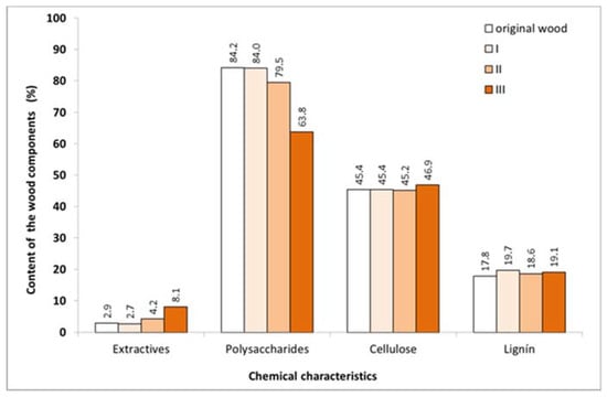 Figure 2 details the changes in the polysaccharide fraction in birch wood according to the steaming mode. The proportion of polysaccharides decreased with increasing steaming temperature, while the degradation of polysaccharides accelerated with increasing steaming temperature. A decrease of 0.2% was observed at 105 °C (mode I), 4.7% at 125 °C (mode II) and 20.4% at 135 °C (mode III). Since the proportion of cellulose in the steaming process changed only minimally, nearly the entire decrease can be attributed to the loss of hemicellulose (Figure 3). The results obtained are in agreement with the conclusions of Kačík [], according to which the loss of holocellulose in hydrothermally treated wood occurs mainly through the degradation of non-cellulosic polysaccharides.