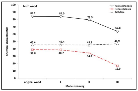 The greatest changes in the birch wood after steaming were observed in the polysaccharides, with the greatest decrease in polysaccharide content resulting from mode III—a steam temperature of 135 °C. At this temperature, a small relative increase in the cellulose content caused by the degradation of the more labile wood components was apparent.