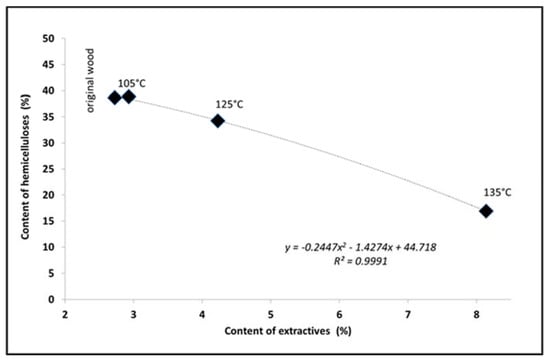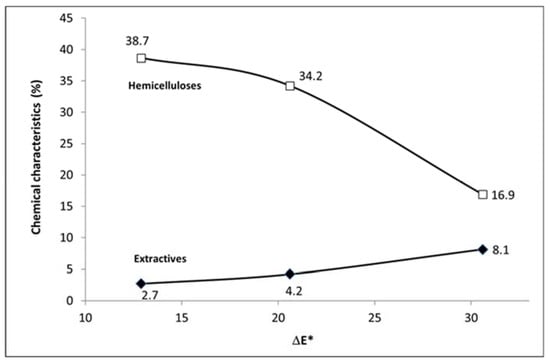 To evaluate the colour changes of wood, the total colour difference ∆E* is often used, which involves changes of all three colour coordinates (L*, a*, b*). Figure 10 shows the strong dependence of the total colour difference ∆E* on the content of hemicelluloses and extractives. In particular, the extractives may play a significant role in the formation of secondary colour compounds during hydrothermal treatment. According to previous studies, colour changes of wood can be due to the formation of new chromophore groups that arise from polysaccharide degradation, dehydration products, free radicals and the phenolic hydroxyl groups of lignin [,].