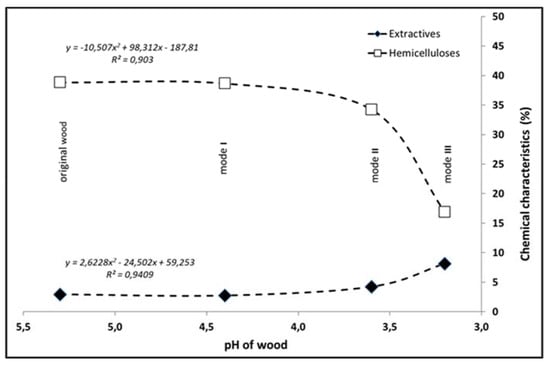 The changes in the contents of hemicelluloses and extractives as a function of pH showed that a significant shift of pH to the acidic region below 4.0 was accompanied by greater degradation of hemicelluloses and, consequently, an increased production of extractable substances (Figure 5).