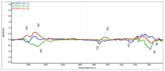 The differences in ATR-FTIR absorption spectra were used to further elucidate the changes in chemical substances taking place in birch wood during steaming. When interpreting the differential spectra of cellulose, holocellulose and wood, which according to Nemeth et al. [], were normalised to the maximum band at 1373 cm−1 (i.e., the band characterising stable C—H cellulose binding), we focused mainly on the groups and bonds responsible for the colour change of the steamed wood [,] (note: for better visual orientation, the different spectra in Figure 6, Figure 7 and Figure 8 are shown at the same scale).
