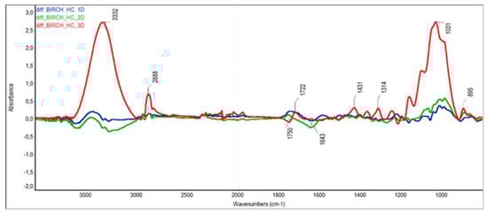 Holocellulose differential spectra show several changes compared to cellulose differential spectra, some of which can be influenced by the holocellulose preparation method. In particular, a pronounced positive band at 3332 cm−1 characterises intramolecular hydrogen bonds in cellulose. The increase in intramolecular hydrogen bonding of the —OH groups observed in mode III was probably due to the degradation reactions of hemicellulose that occurred during the holocellulose preparation. In particular, the positive band of the CH2 group at 2888 cm−1 and the band at 1431 cm−1 indicated the dehydration reactions of hemicelluloses associated with xylan formation. The changes in absorbance at 1750 cm−1 and 1722 cm−1 indicated a slight increase in the content of unconjugated carbonyls associated with the cleavage of acetyls from hemicellulose and the formation of acetic acid, as well as the thermal oxidation of labile polysaccharides. A decrease in absorbance at 1643 cm−1 in mode II indicated a loss of conjugated carbonyls. From the changes in the absorbance areas of C=O and C—O—C bonds between 950 and 1200 cm−1, the overall increase of these groups in the hemicellulose proportion, probably due to thermal oxidation reactions, was inferred as a result of the holocellulose preparation.