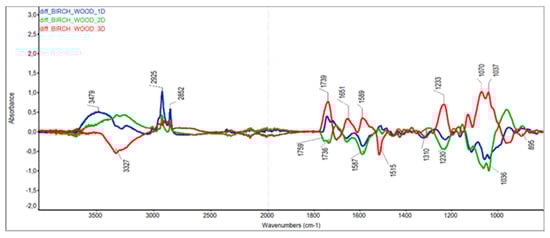 Positive bands in modes I (105 °C) and II (125 °C) at 3200 to 3500 cm−1, and negative bands at 3327 cm−1 in mode III (135 °C), suggest changes in the carbohydrate components of wood—mainly from the significant degradation of hemicelluloses and the subsequent dehydration reactions. The decrease in absorption bands at 2925 and 2852 cm−1 is mainly attributed to the birch wood extractives, whose contents gradually decreased with the steaming temperature. The content of unconjugated carbonyl, carboxyl and ester groups (above 1700 cm−1) and conjugated carbonyls (below 1700 cm−1) also showed an interesting course. In modes I and II, there was an increase in unconjugated carbonyls, while in mode III, an increase in both unconjugated and conjugated carbonyls was observed. The increase in conjugated C=O groups and red colour is presumably due to hydrolysis and oxidative transformation of polyphenols to dark colour polymers [].