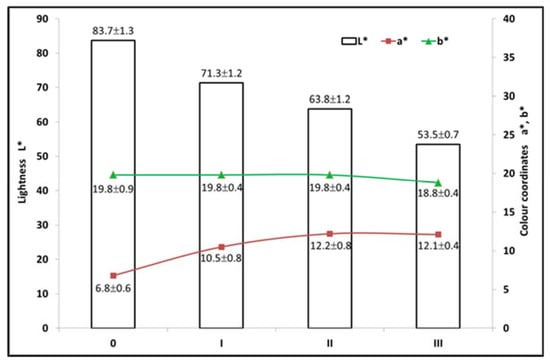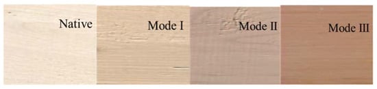 Hydrothermal treatment is a method often applied to pretreat wood materials, which must obtain certain external and internal wood properties, for example, relating to colour, plasticity and durability. During hydrothermal treatment, the wood is treated with water respectively with water vapor at different modes—temperature, pressure, time, hydro module []. Moisture presence in the wood is a necessary condition for the chemical reaction runs and to achieve the homogeneous discolouration throughout the whole cross section of wood. Chen et al. [] used saturated steam at a lower temperature and at a higher humidity of wood for obvious discolouration with no effect on polysaccharide components. Although the saturated steam method effectively induces discolouring, it has so far received less attention by the wood industry. Goal-directed changes in colour by hydrothermal treatment of full volumes of wood have great practical importance, especially in the production of furniture, decorative products and other wood products [].