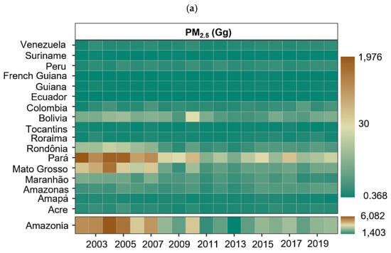 On average, Amazonian biomass burning emitted 3306 Gg year−1 of PM2.5. The year 2004 had the highest emission of PM2.5 associated with biomass burning in Amazonia during the 2002–2020 interval (6082 Gg), while 2013 had the lowest annual estimate (1403 Gg). The Pará and Mato Grosso states, located in Brazil, had the highest annual average emission of PM2.5 from biomass burning during 2002–2020 (1105 Gg year−1 and 598 Gg year−1, respectively) representing, respectively, 33% and 18% of the Amazonian average PM2.5 emitted from biomass burning (Figure 3a).